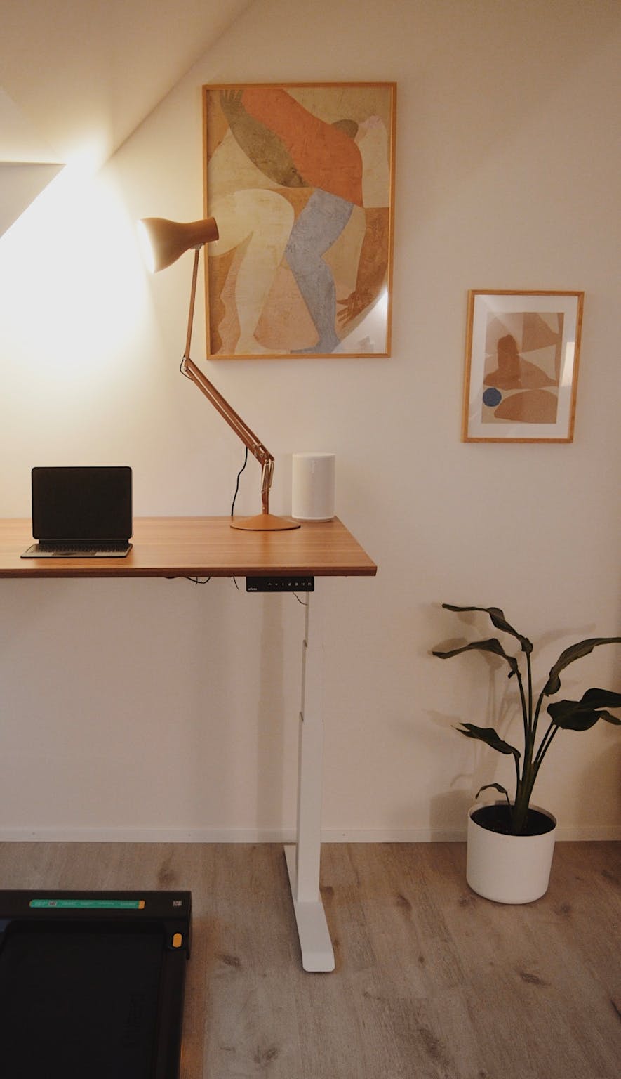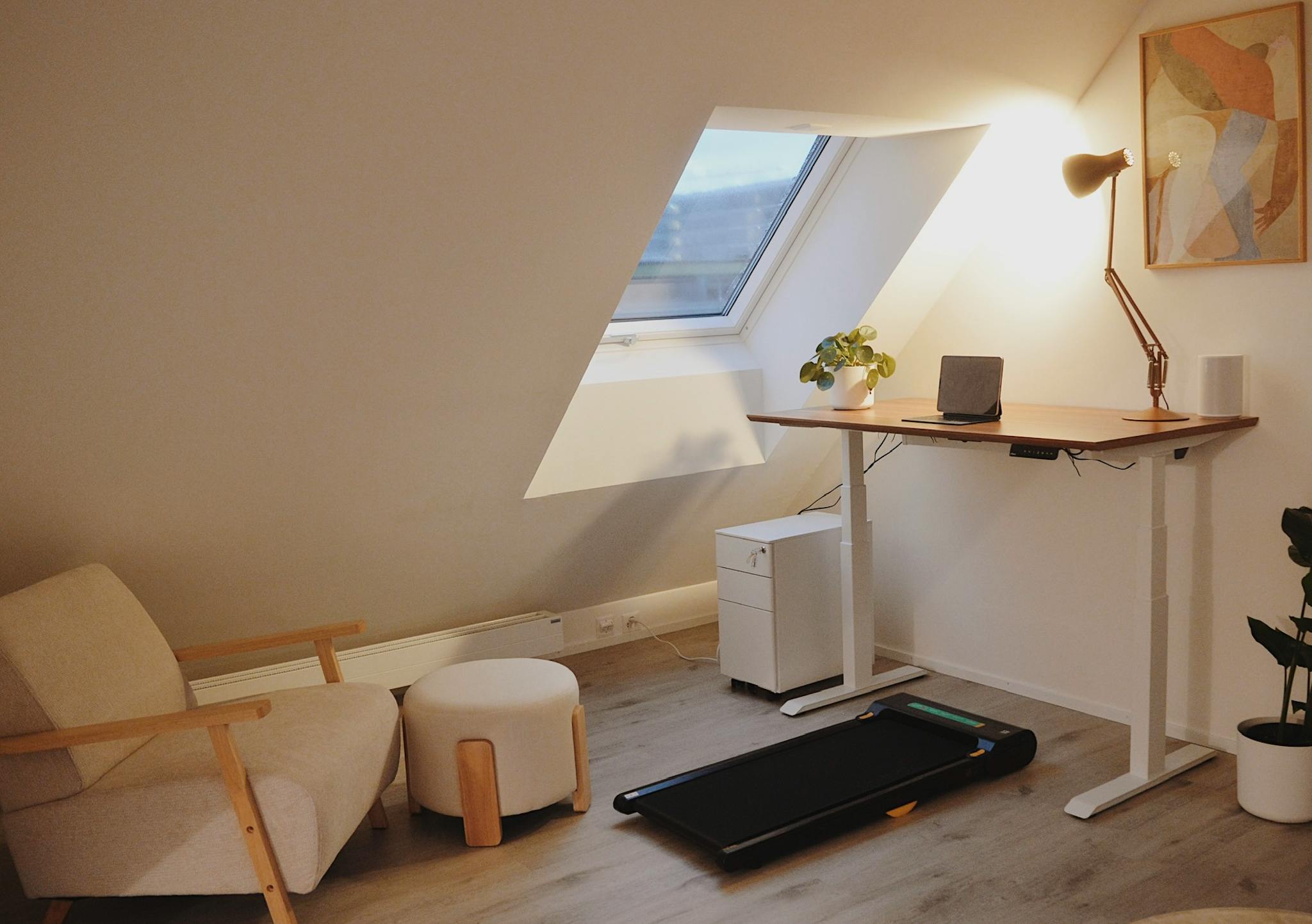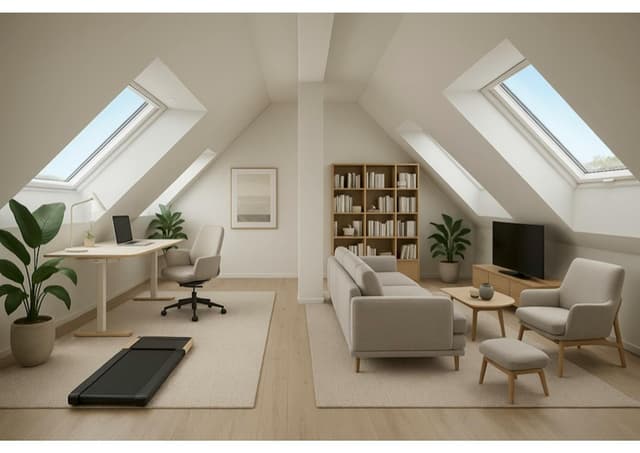 • Ergonomic home office setup with height-adjustable desk and chair for a healthy work environment