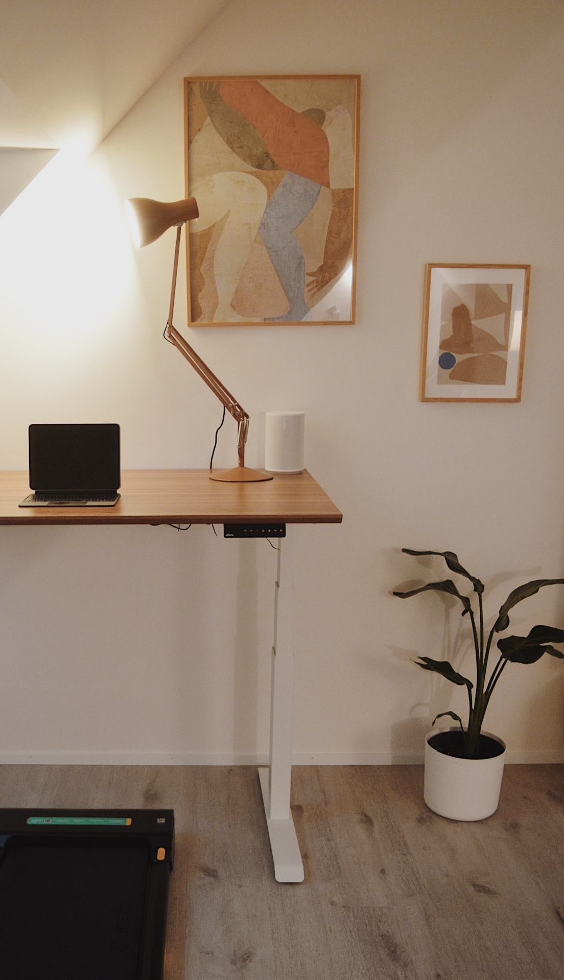 • Ergonomic home office setup with a height-adjustable desk, supportive chair, and optimal lighting to promote healthy posture and productivity