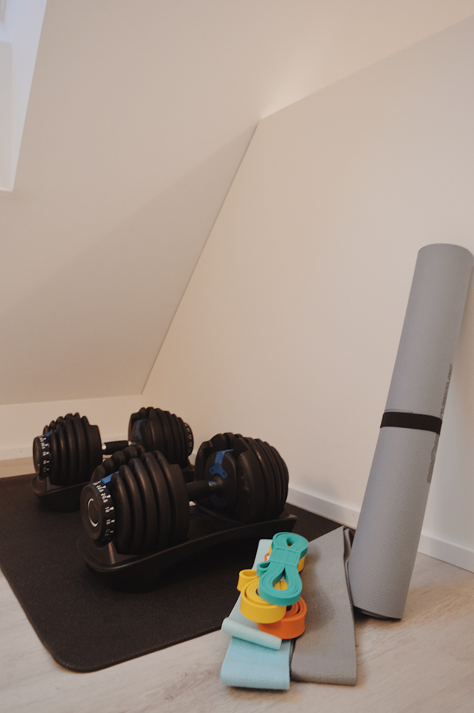 The home gym corner includes carefully selected, professional-grade equipment—ideal for maintaining strength, flexibility, and posture even on busy days.