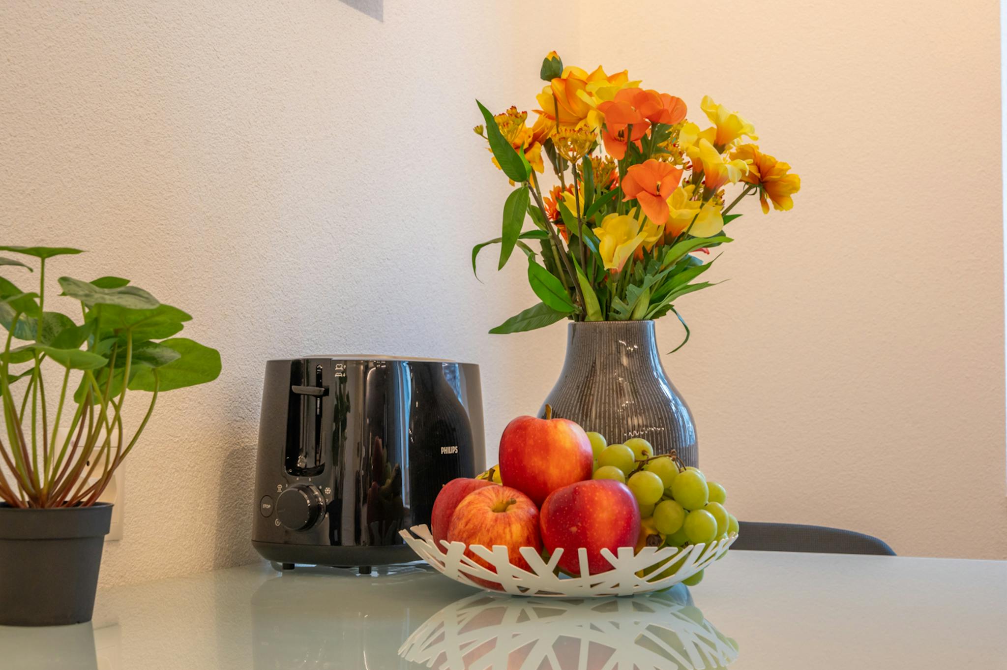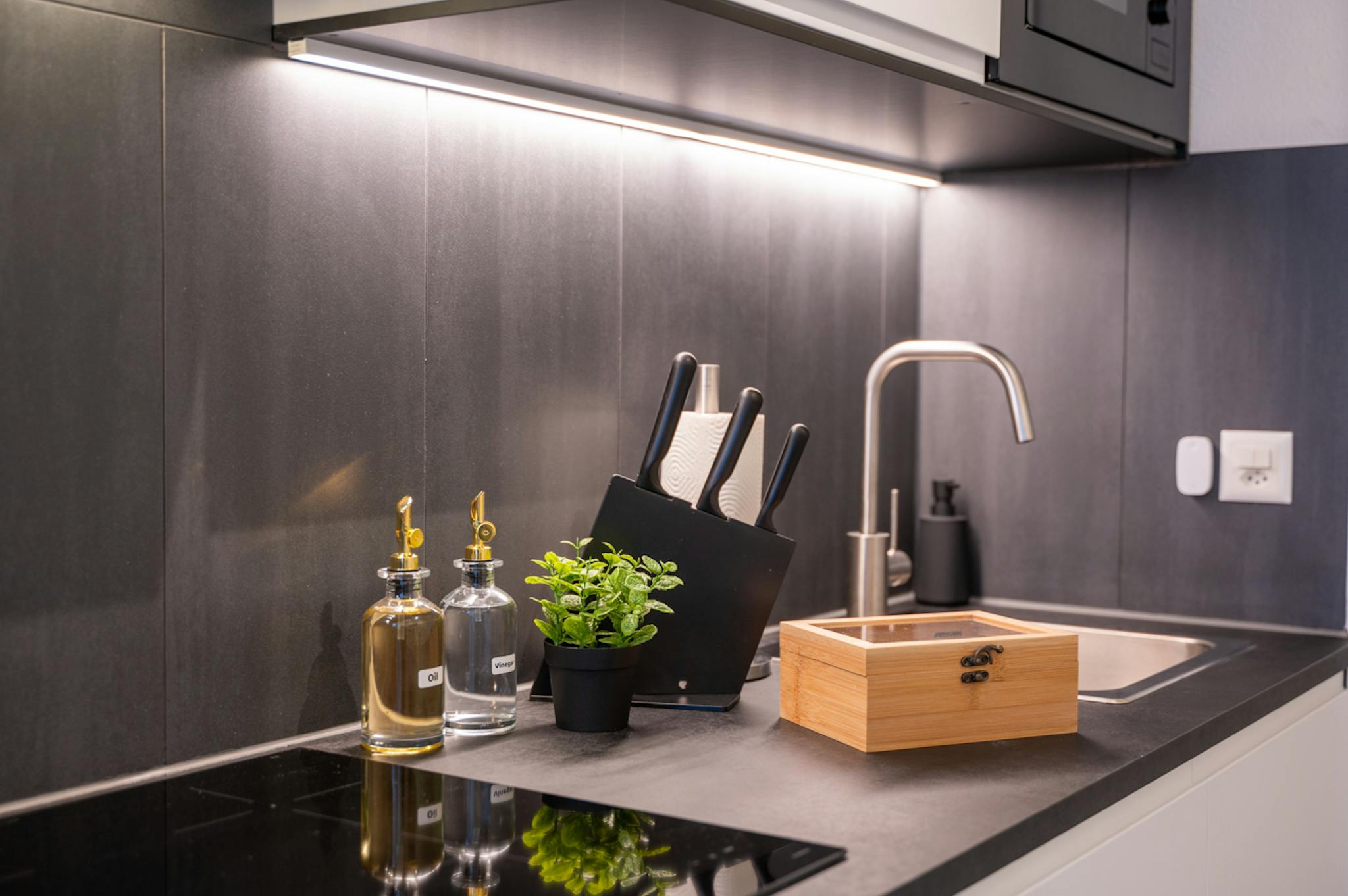 The modern, fully equipped kitchen with an induction hob, hot oven, efficient dishwasher, aromatic coffee machine, etc. has everything you need to cater for yourself. Coffee pods and tea are of course included in our kitchen equipment.