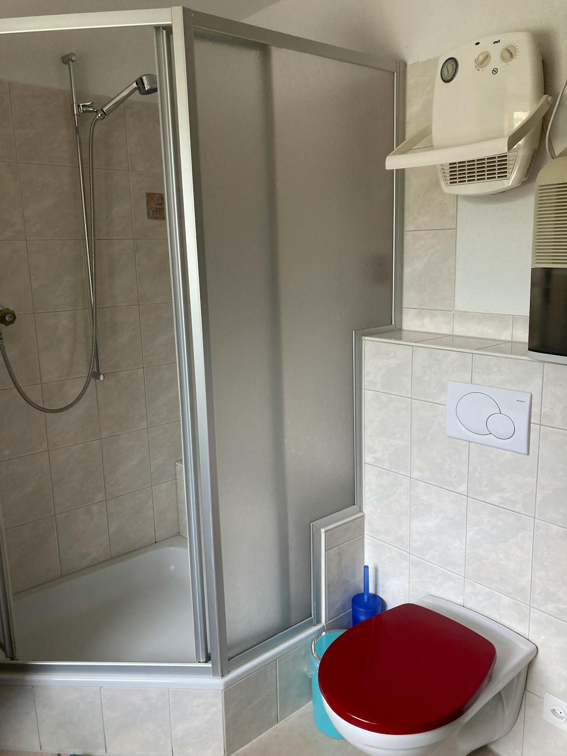 Gegenüber des von Ihnen gemieteten Zimmers befinden sich im Wirtschaftsraum Dusche und Toilette, dessen alleinige:r Benutzer:in Sie sind.
