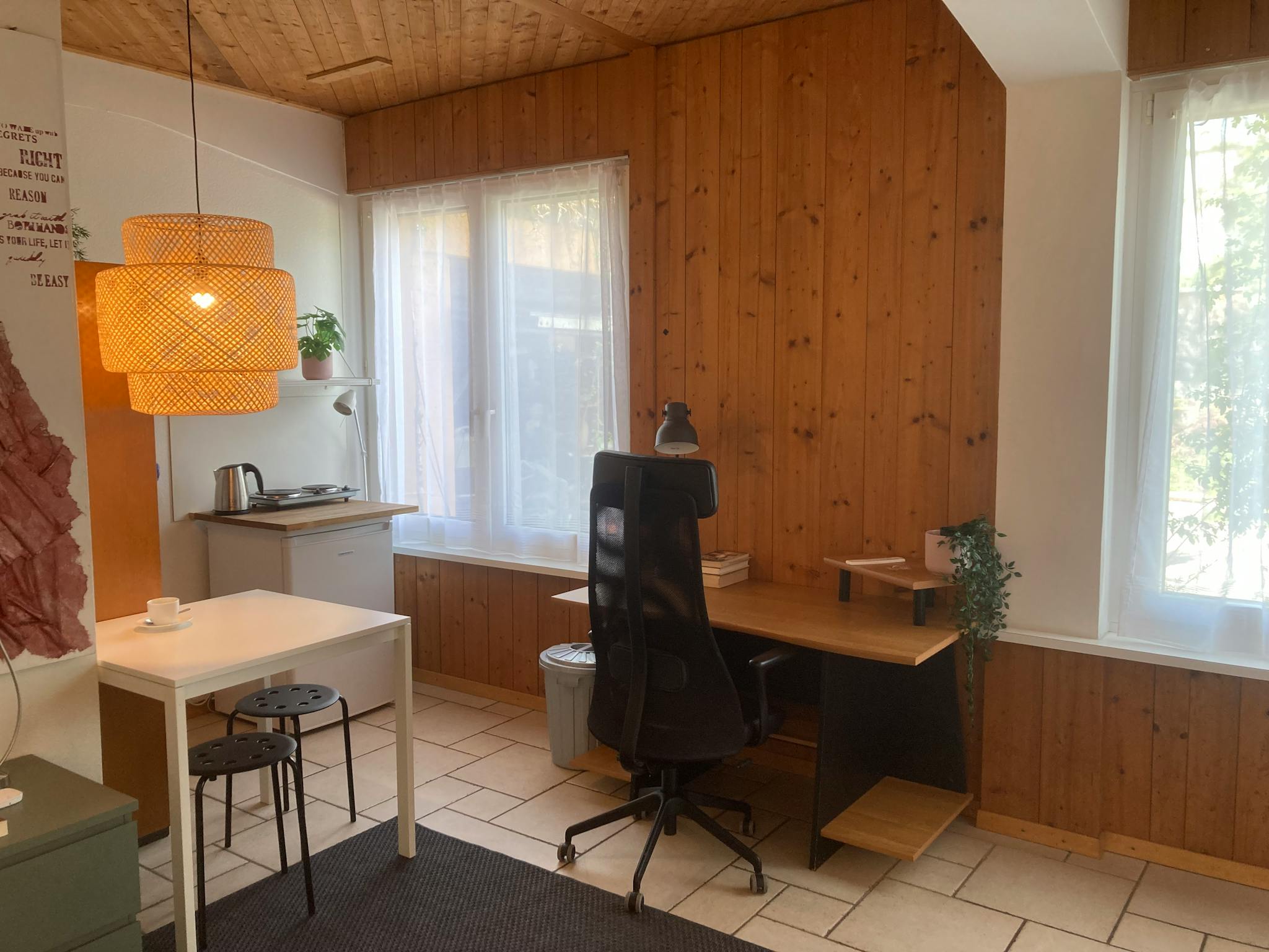 Hier wohnen Sie in einem einem autarken Zimmer, ebenerdig zugänglich in einem der Biodiversität gewidmeten Haus, mitten im Zentrum von Bassersdorf, direkt neben einer Bushaltestelle.