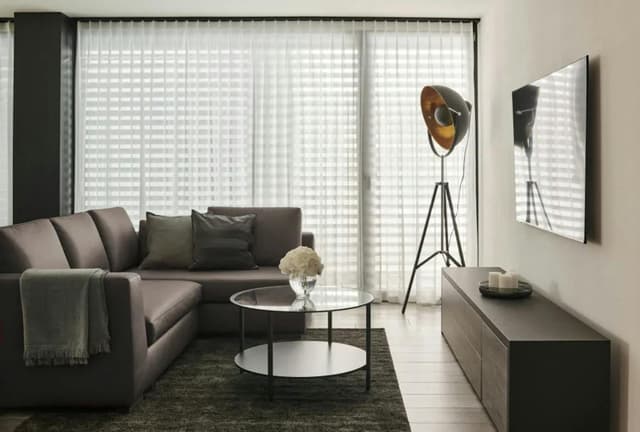Unwind in the living room with a cozy sofa and a 65-inch smart TV. High-speed internet keeps you connected. Plenty of storage and parking available on request (additional cost).