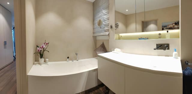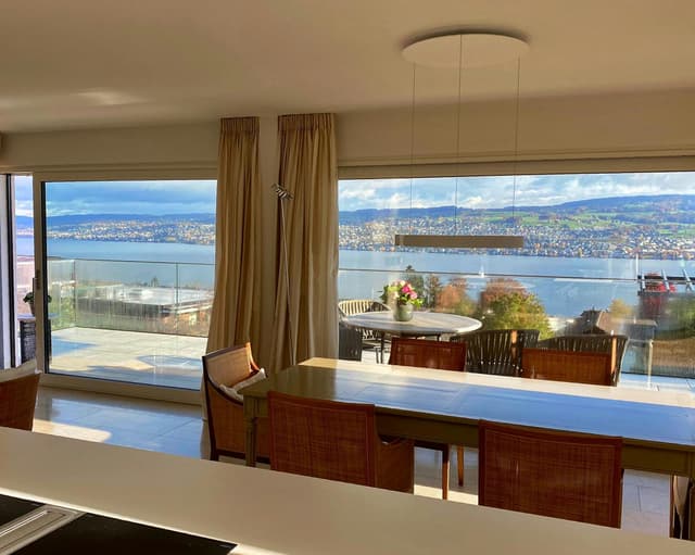 This modern, luxuriously furnished 3.5 room apartment with lake view, spacious balcony and garden with a beautiful seating area on the left side of Lake Zurich is located in an exclusive and affluent district above Horgen, near Oberdorf train station, ideally embedded between Zurich and Zug. From the dining area, the kitchen and the living area you have a fantastic view of Lake Zurich and the Alps next door.