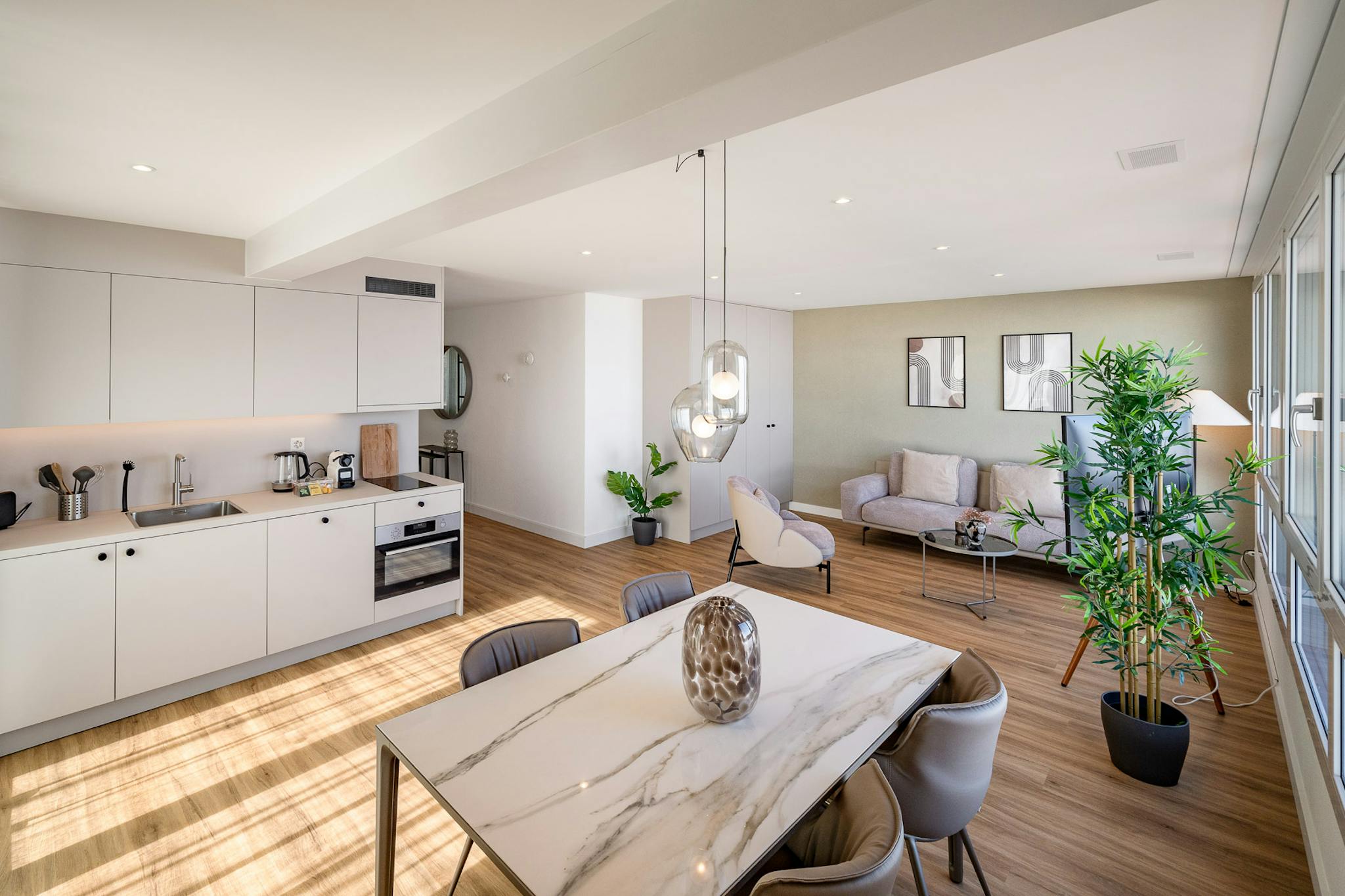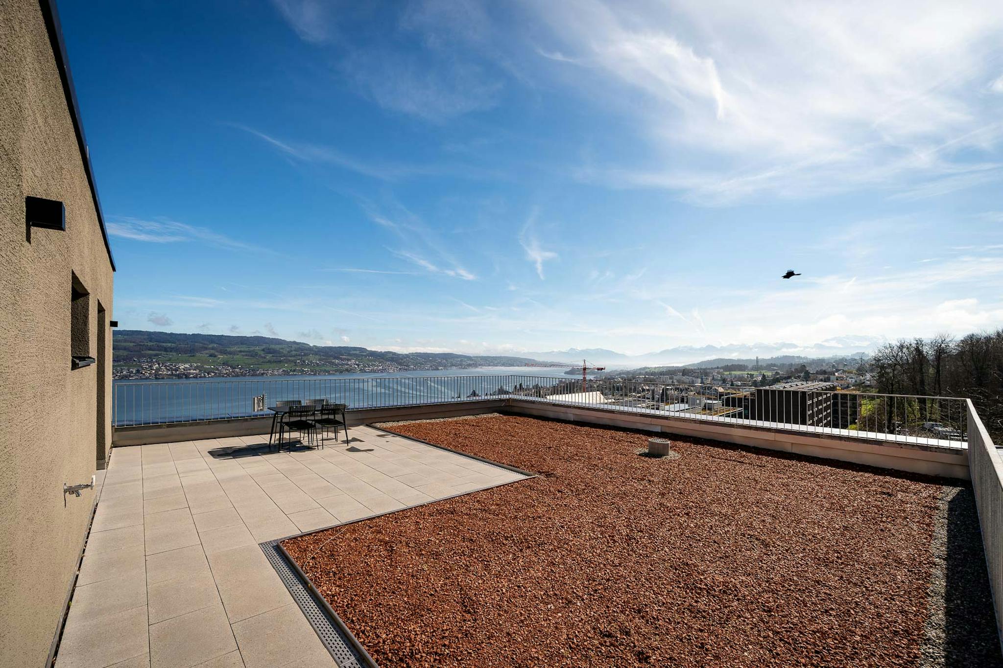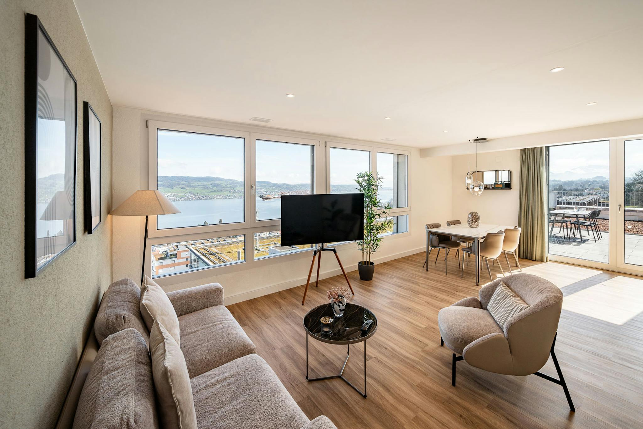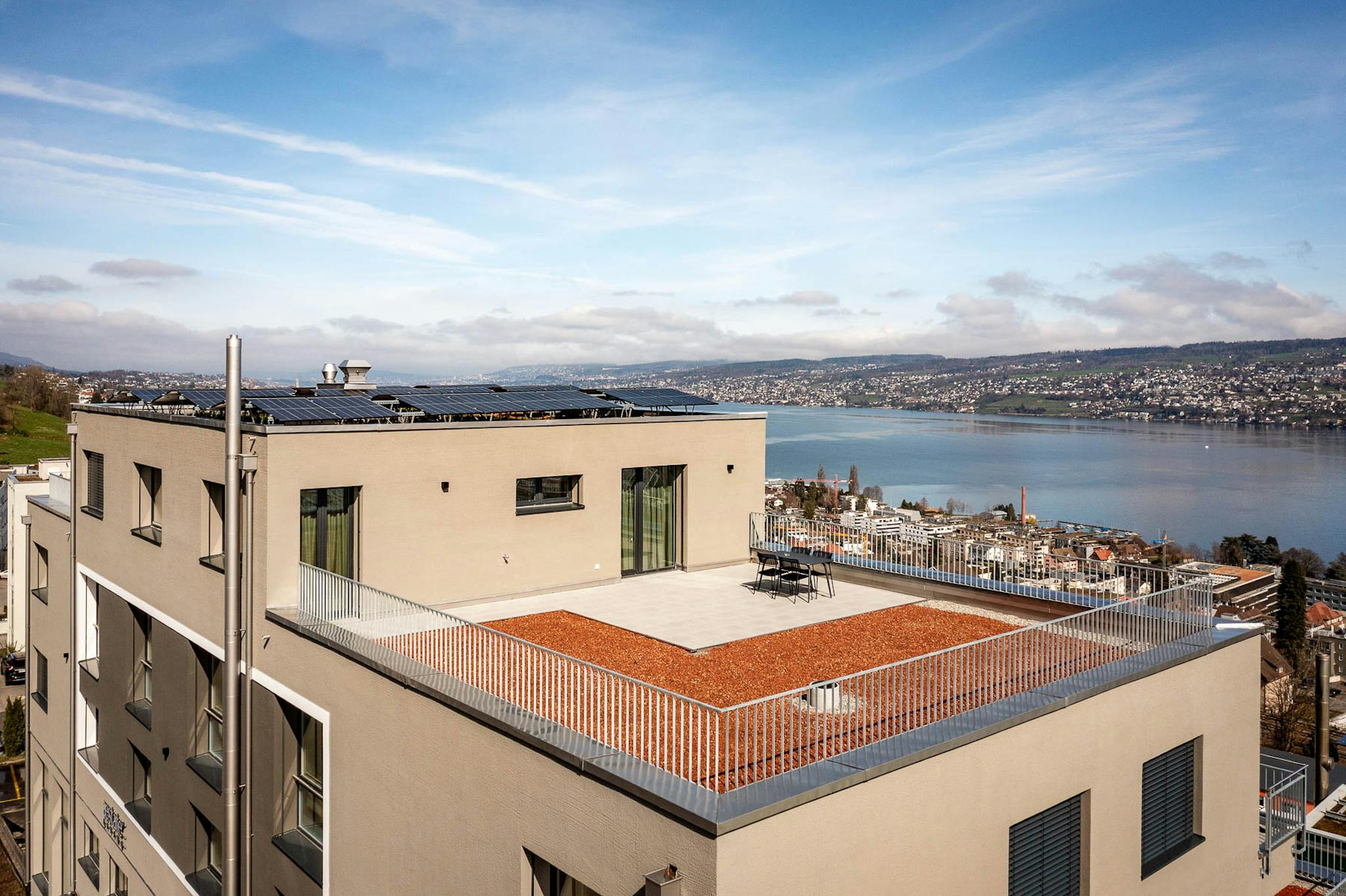 Geniessen Sie den atemberaubenden Panoramablick auf den See und die pulsierende Stadt, den Sie sowohl vom Innenbereich als auch von den grosszügigen Terrassen und Balkonen aus bewundern können.