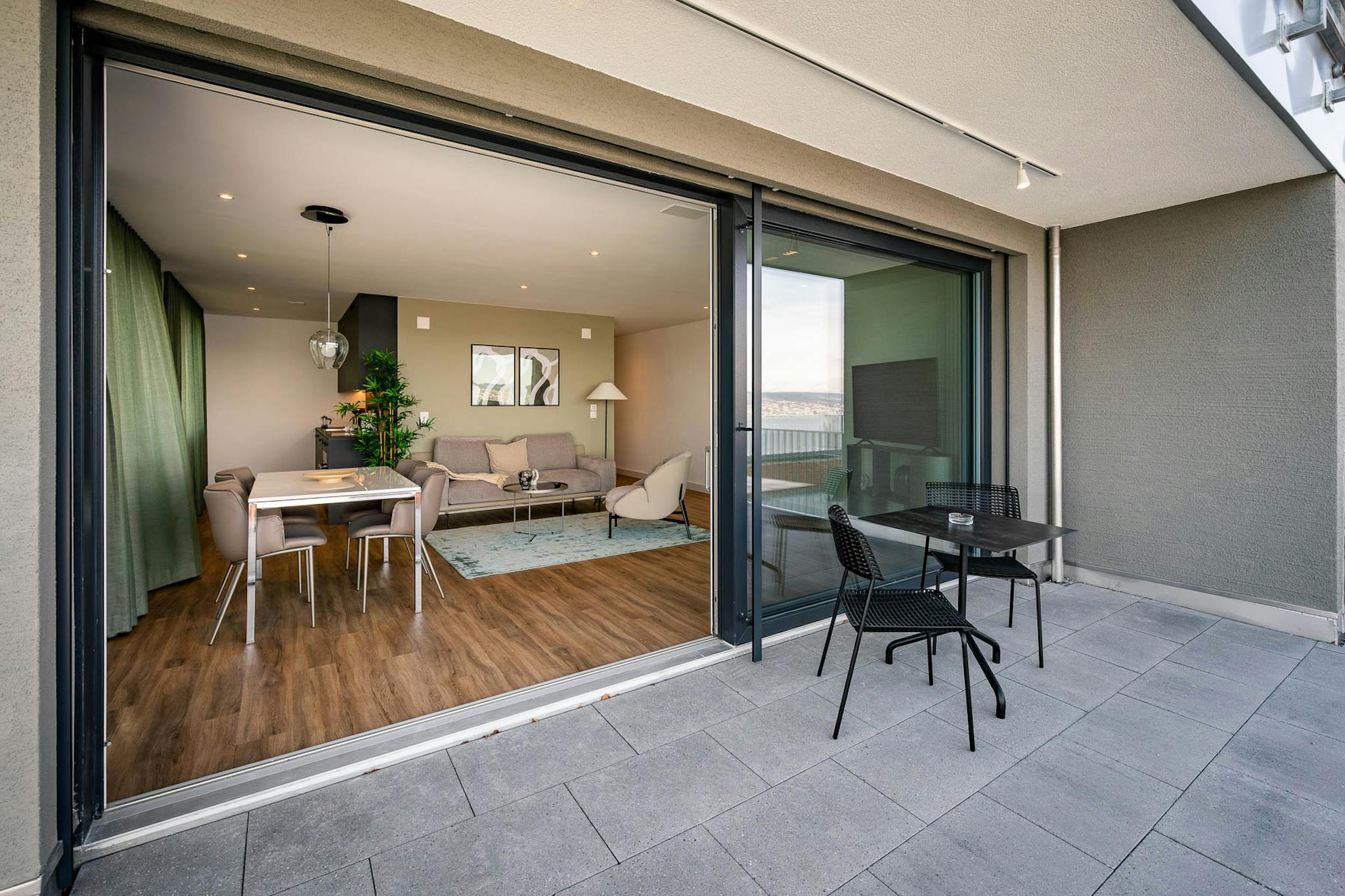 Geniessen Sie den atemberaubenden Panoramablick auf den See und die pulsierende Stadt, den Sie sowohl vom Innenbereich als auch von den grosszügigen Terrassen und Balkonen aus bewundern können.