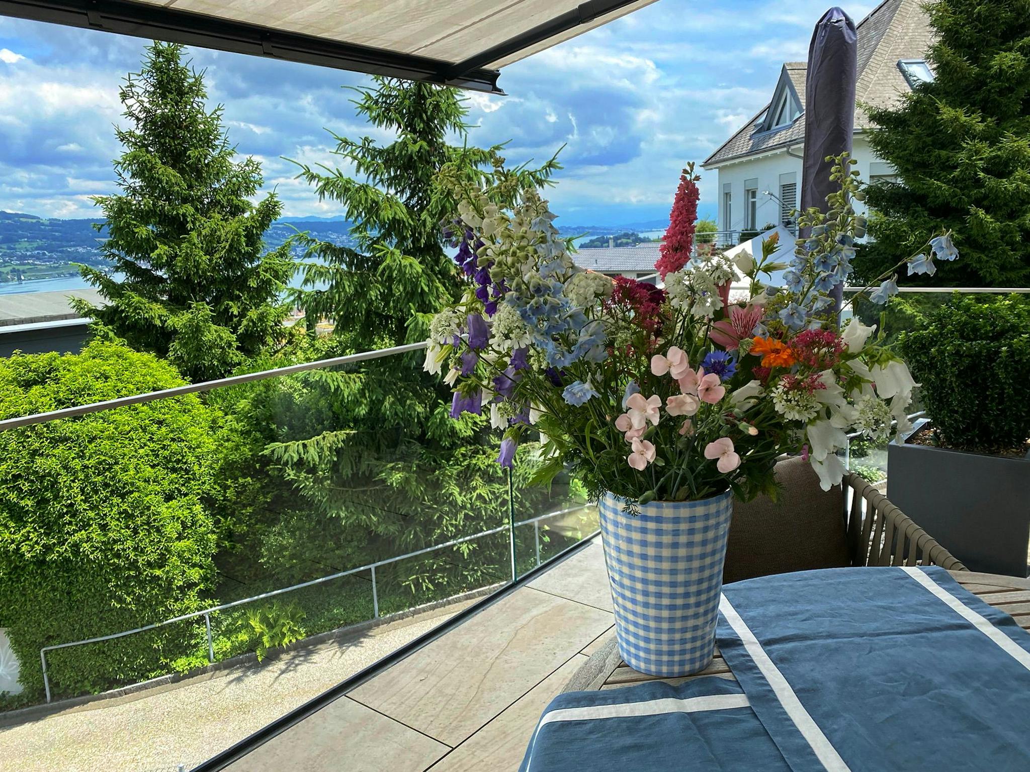 This modern, luxuriously furnished 3.5 room apartment with lake view, spacious balcony and garden with a beautiful seating area on the left side of Lake Zurich is located in an exclusive and affluent district above Horgen, near Oberdorf train station, ideally embedded between Zurich and Zug. From the dining area, the kitchen and the living area you have a fantastic view of Lake Zurich and the Alps next door.