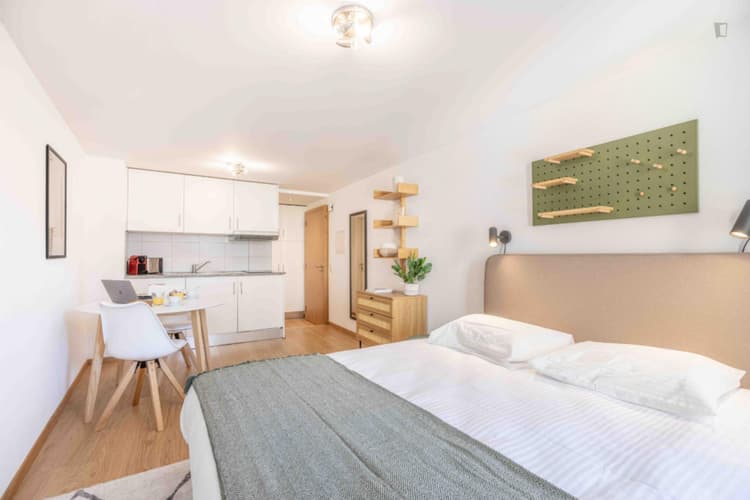 The residence is ideally located in Lausanne city center. Situated on a lively pedestrian street, it is surrounded by numerous leisure spots, shops, major retailers, grocery stores, restaurants and bars. The residence is also close to the old town and just an 8-minute walk from Lausanne Cathedral. Located in a central neighborhood, it offers excellent access to public transportation with several bus stops nearby. The subway station is very close, just a 5-minute walk away, with lines connecting to the train station, universities and the city’s main points of interest. The apartment features a modern, minimalist and cozy design that creates a feeling of space and openness in the living area. In this area, windows facing the street allow natural light to enter. Very well furnished, the apartment includes everything needed to ensure optimal comfort during your stay and make you feel right at home. The apartment is furnished with a comfortable Queen-size bed, and a fully equipped kitchen including induction cooking hob, extractor hood, refrigerator with freezer box, all necessary cooking utensils, dishes, Nespresso coffee machine, toaster, kettle and ample storage. The modern bathroom features a walk-in shower. In the living area, you'll find a table with chairs for dining or working, a comfortable sofa and a flat-screen TV. The building is equipped with a laundry room featuring washing machines and dryers available to all tenants 24/7. A baby cot is available as an extra and pets are allowed for an additional fee. The apartment is also equipped with vacuum cleaner, mop, iron and ironing board. Housekeeping service is available at an extra cost, one time, weekly, bi-weekly or monthly.