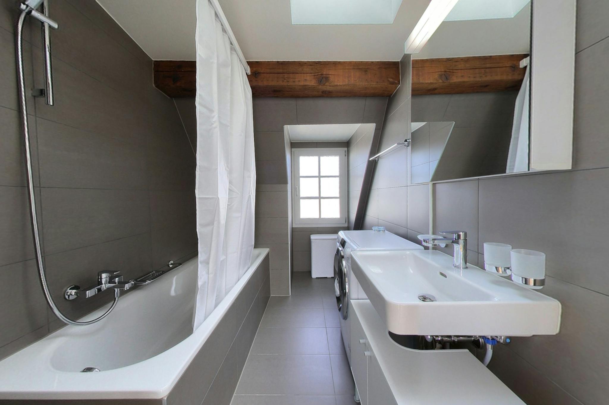 The bathroom has a bathtub with shower and benefits from a washing machine.