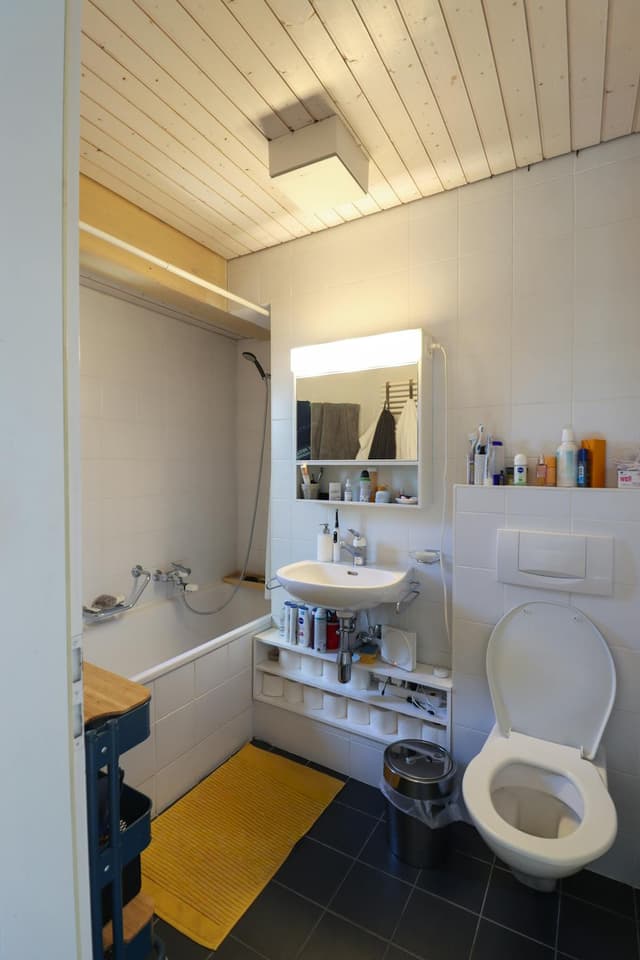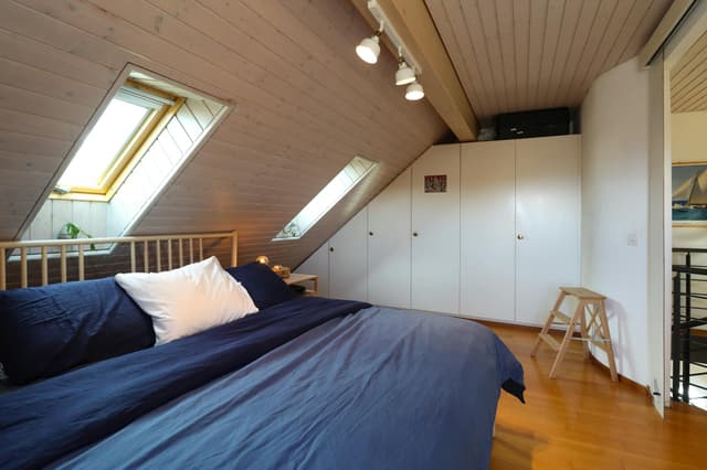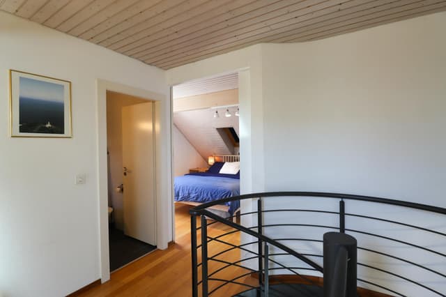 À l’étage supérieur se trouvent une chambre à coucher et une salle de bain avec baignoire.