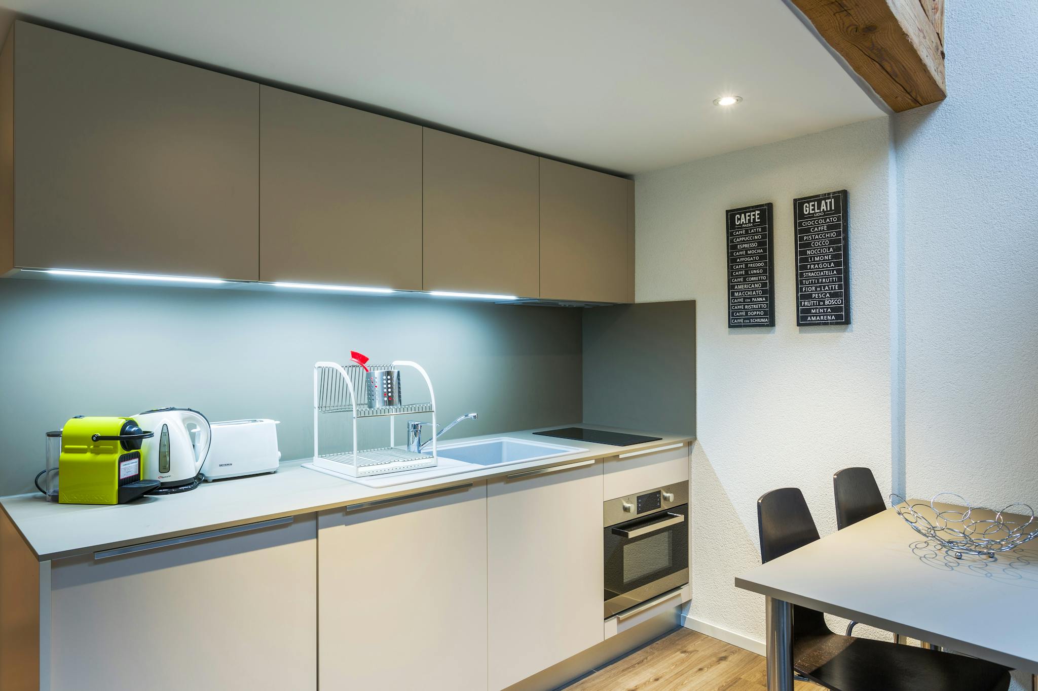 The entrance leads to an open-plan kitchen and sitting room, with windows overlooking the high street. The fully-equipped kitchen includes a combination microwave-oven, fridge, and hob. A washing machine is also available in the apartment.