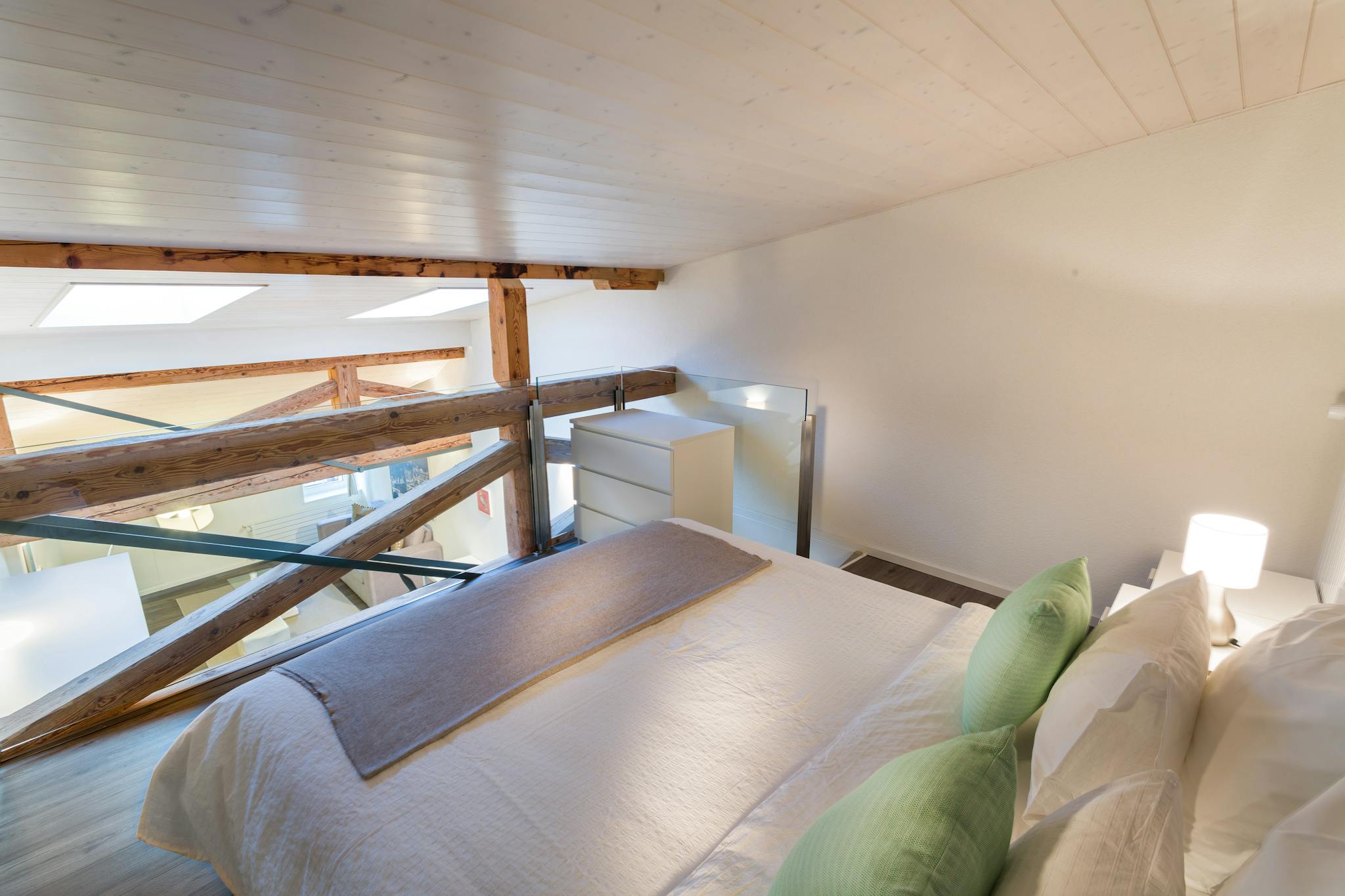 A mezzanine level above the kitchen offers a generous double bed, and the spacious bathroom includes a shower.