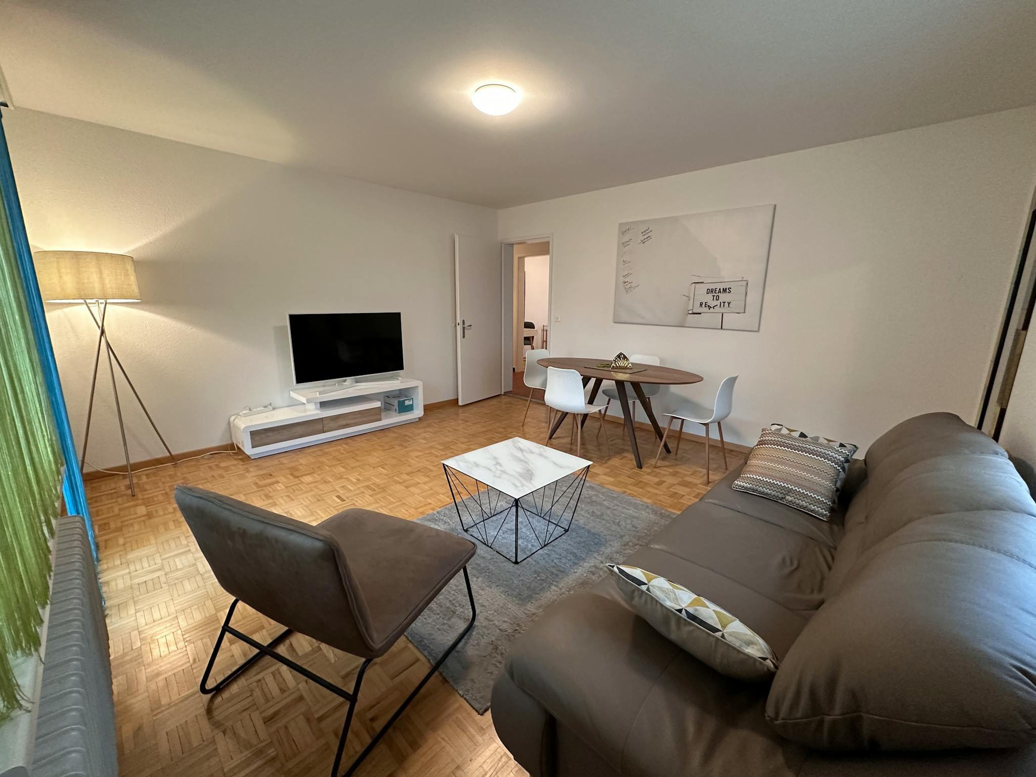 The living room has a smart TV, sofa and ambient lighting.