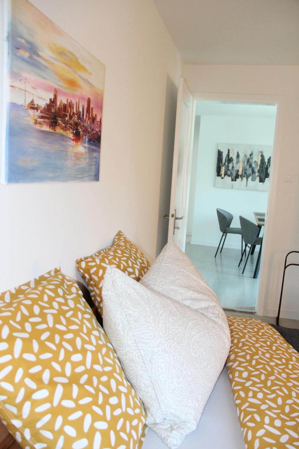 There are two bedrooms decorated with a combination of abstract design and soft tones bringing a feeling that is pleasantly surprising.