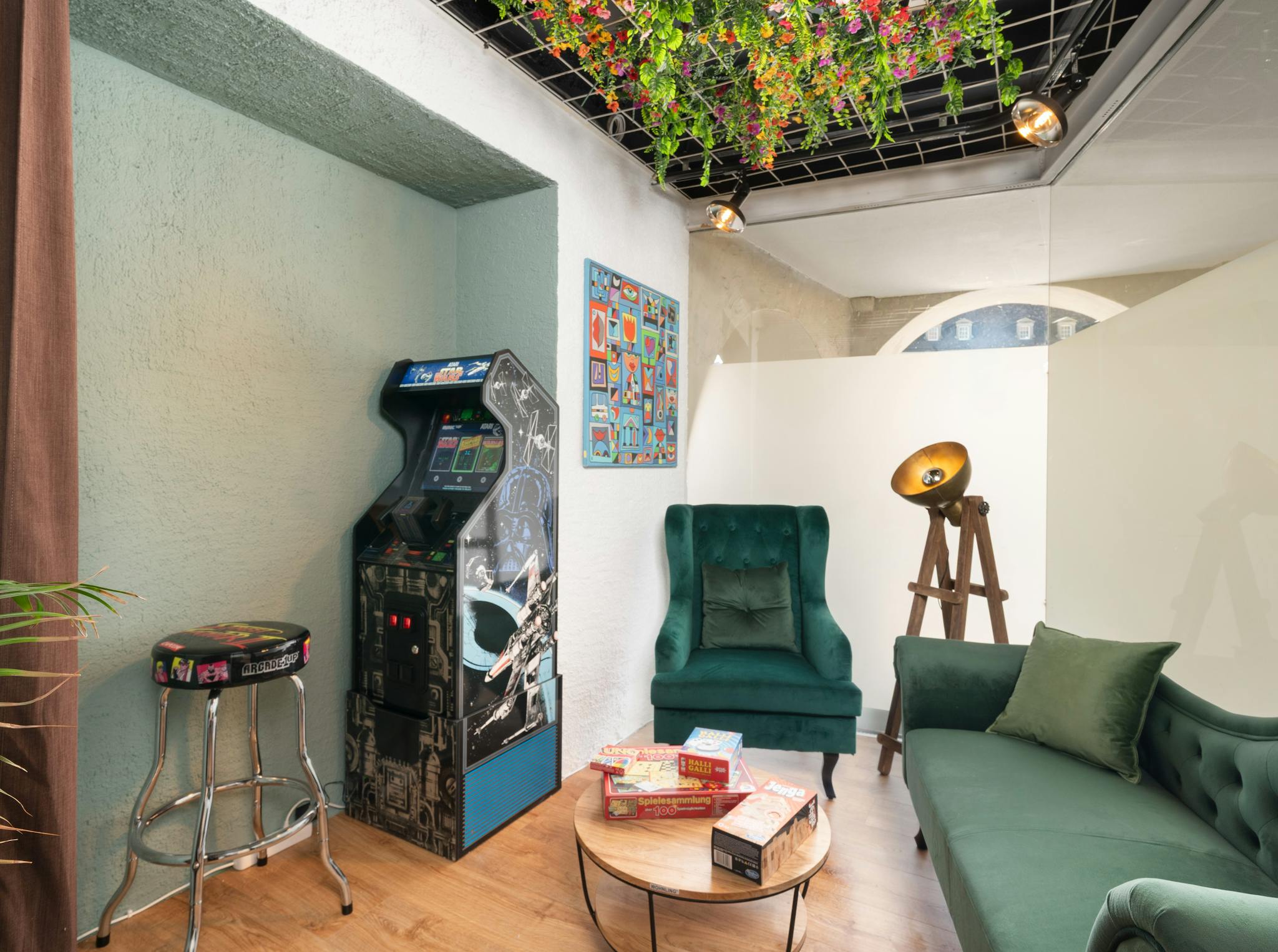 Hier erwartet dich die Retro-Arcade-Lounge mit Star-Wars-Automat, grüner Samtcouch und Spieletisch, ideal für gemeinsame Abende. Außerdem findest du eine Gästetoilette und einen Waschraum mit Waschmaschine, Bügeleisen und Wäscheständer. Sowie ein Hochwertige Schlafsofa mit ausziehbarer Matratze.