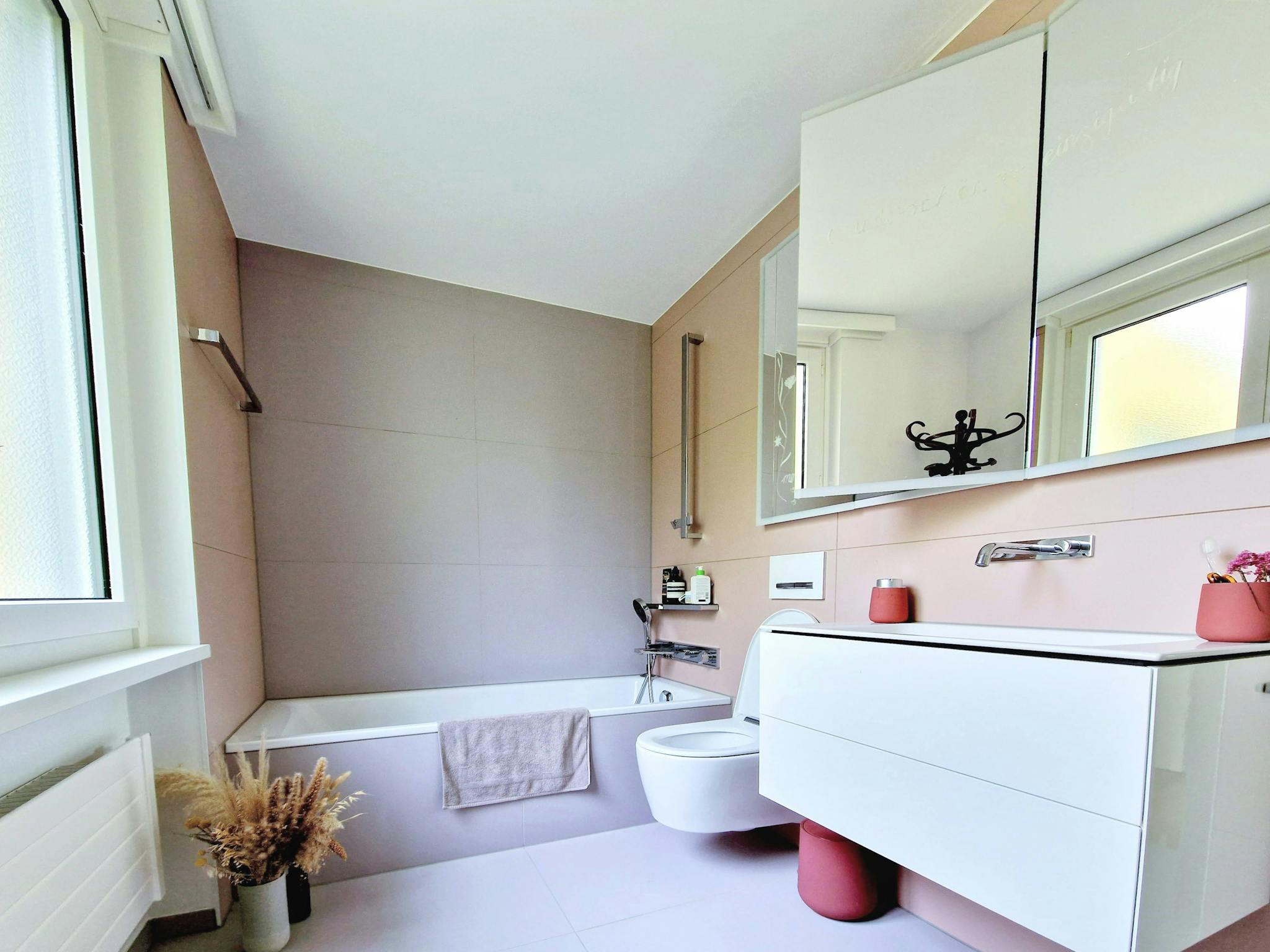 Enjoy peace and greenery from the sunny balcony — the forest is just a 5-minute walk away. Shops are within 7 minutes on foot, and the nearest bus stop is only 3 minutes away. The train station offers direct connections to Zurich Airport and the main station in just 13 minutes. Two private parking spaces are included.