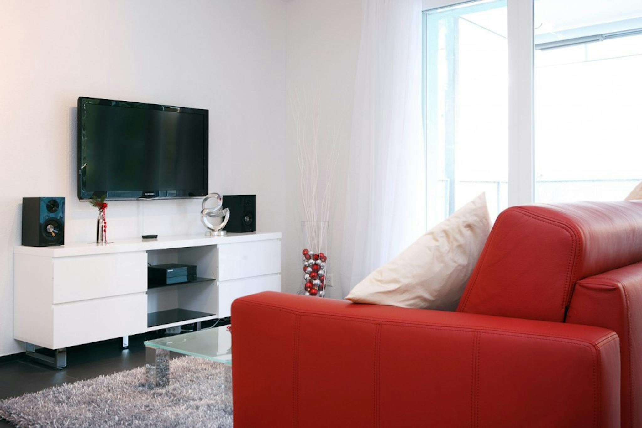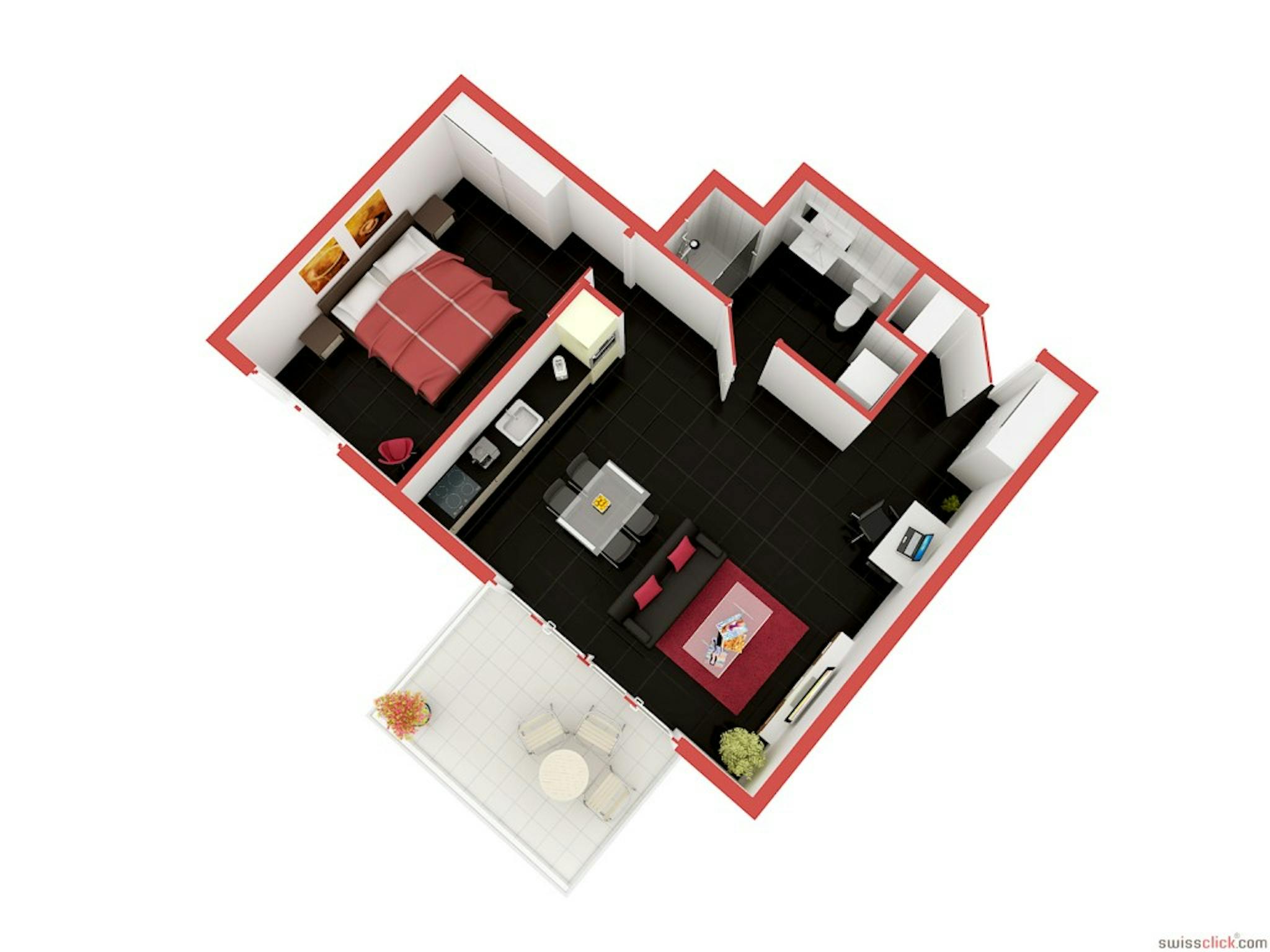 These 21⁄2 room flats offer plenty of space with a separate living and sleeping area and a large balcony or garden seating area. The living room is furnished with a leather sofa bed and glass dining table.
