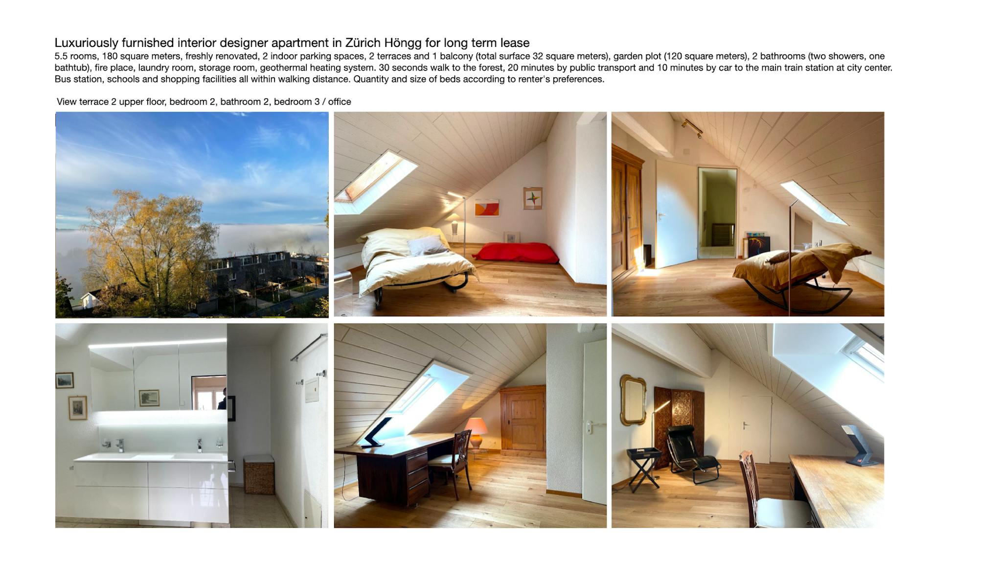 5.5 rooms, 180 square meters, freshly renovated, 2 indoor parking spaces, 2 terraces and 1 balcony (total surface 32 square meters), garden plot (120 square meters), 2 bathrooms (two showers, one bathtub), fire place, laundry room, storage room, geothermal heating system. 30 seconds walk to the forest, 20 minutes by public transport and 10 minutes by car to the main train station at city center. Bus station, schools and shopping facilities all within walking distance. Quantity and size of beds according to renter's preferences.