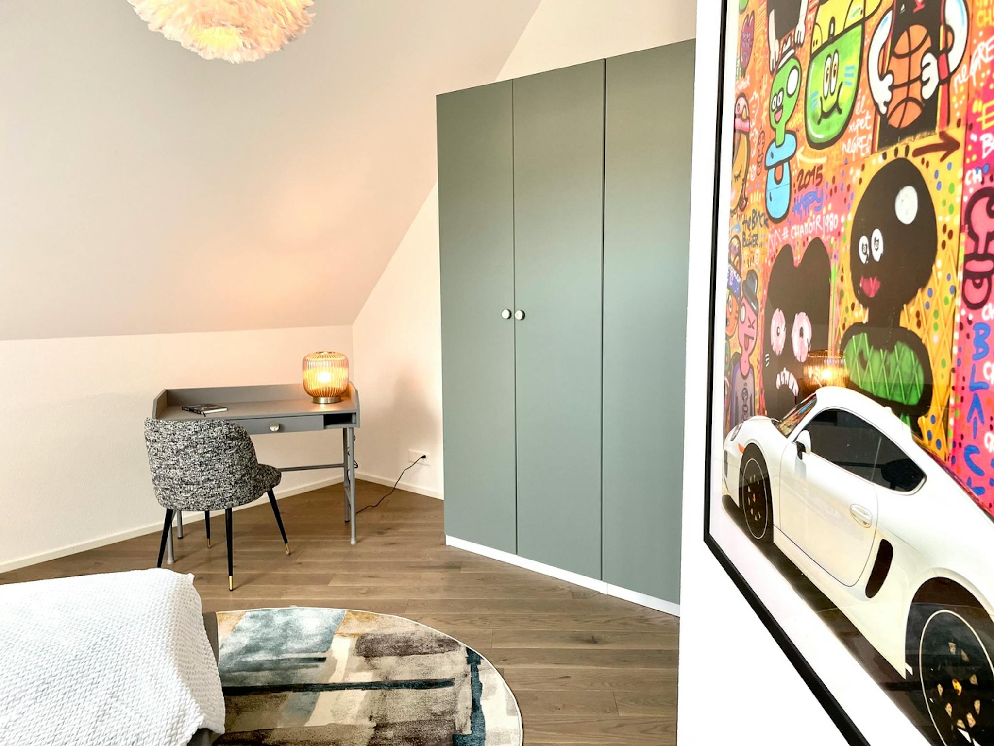 An elevator accesses the apartment directly on the sixth floor. The apartment features high ceilings and ample natural light through the many windows with incredible views of the Uetliberg and charming Wiedikon on a total of 115 sqm. The living room and kitchen with dining area is separated by a super cozy loggia terrace. Since this is the highest apartment in the property, you almost have the impression that you live in your own house. In total there are two spacious bedrooms and two bathrooms (1 en-suite from the master bedroom). The master bedroom has a king size bed, while the second bedroom has been furnished with two single beds. Home office and homeschooling? No problem; office desks in each room are also provided. The icing on the cake in this exceptional apartment is exquisite artwork from the past and the modern era – artwork by British artists and photographs by renowned photographers will put you in the mood for enjoying your new home.