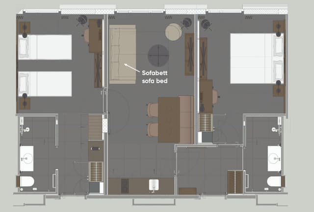 In these very comfortable 44 sqm hotel (hidden), the living and dining area is separated. from the bedroom, making these rooms ideal as family rooms. In the living area, there is a sofa bed and an additional flat screen TV. The kitchenette is fully equipped, and the dining table seats six people.