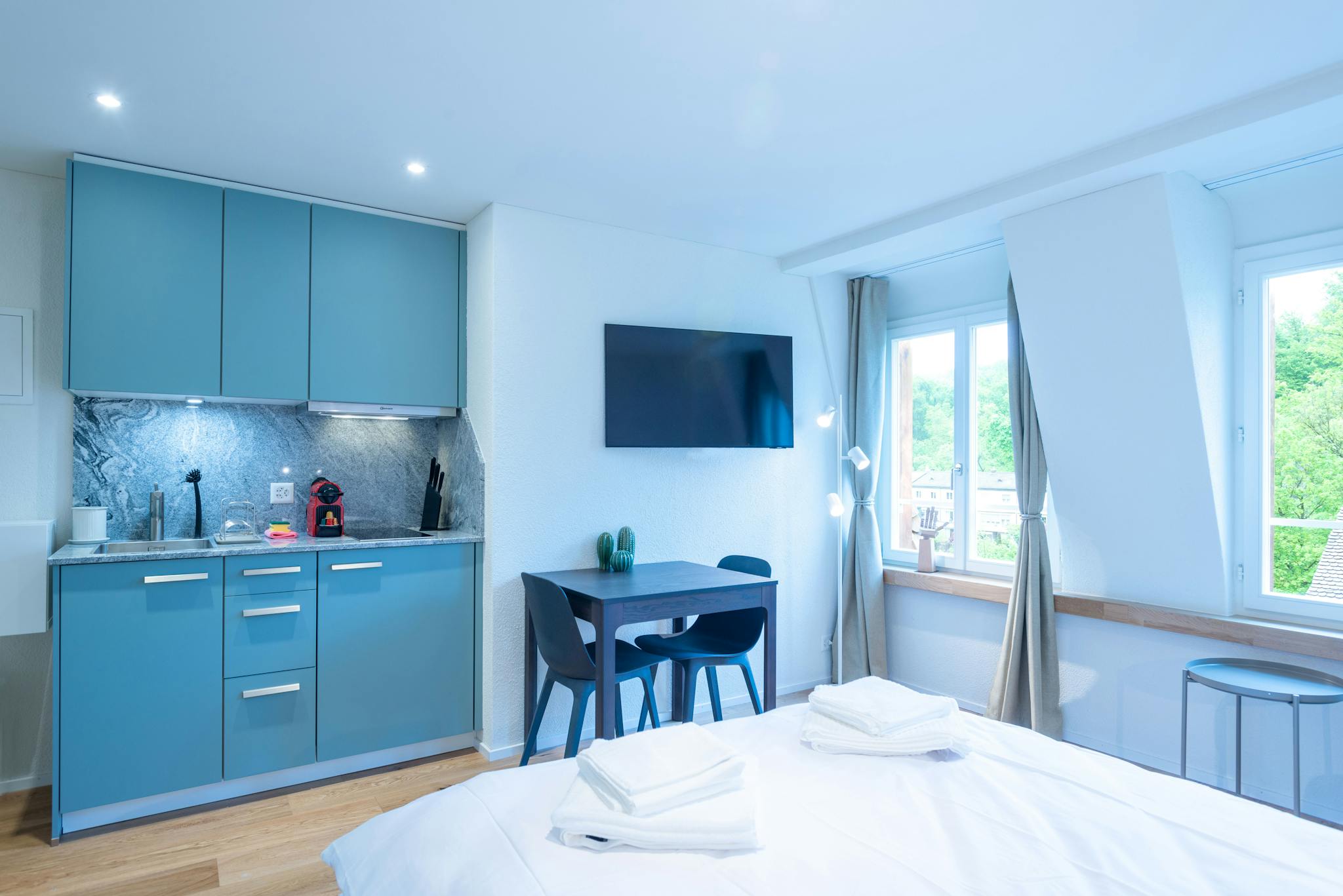 This furnished flat is the ideal accommodation for business travellers coming to Zurich. The furnished flat impresses with its unique location and elegant design. In the studio you will find everything you need for work and leisure. In the cosy living/sleeping area you will feel at home and in the kitchen you will find everything you need to cook. Of course, a private bathroom with shower belongs to the flat. All in all, this furnished business flat offers all-round comfort in a prime location! The flat in Zurich includes the following services: WiFi internet, satellite TV with international channels, laundry facilities, monthly cleaning (from 45 nights stay), bed linen, towels and all utilities. Washing machines and dryers are available for free use in (hidden)ment. Pets are allowed for an additional fee. The Serafe radio and television fee is not included in the rental price and must be paid by the tenant. The Riesbach Apartments are an ideal place to live. The apartment building is well connected to public transport. The nearest tram station is only 100m away and from there you can reach Zurich main station in about 15 minutes. Stadelhofen station is only 10 minutes away. The nearest supermarket is only 100m away and in the immediate vicinity are the large Balgrist and Hirslanden hospitals and the University Children's Hospital.