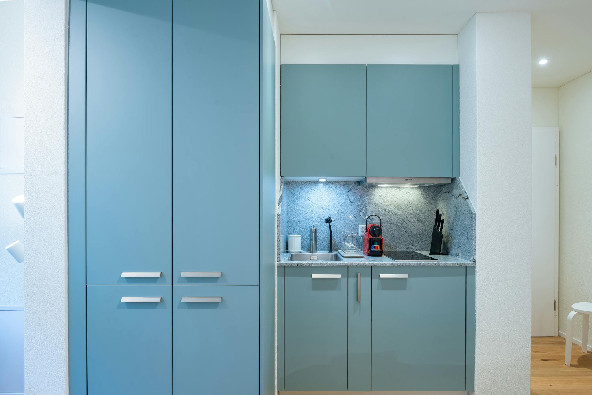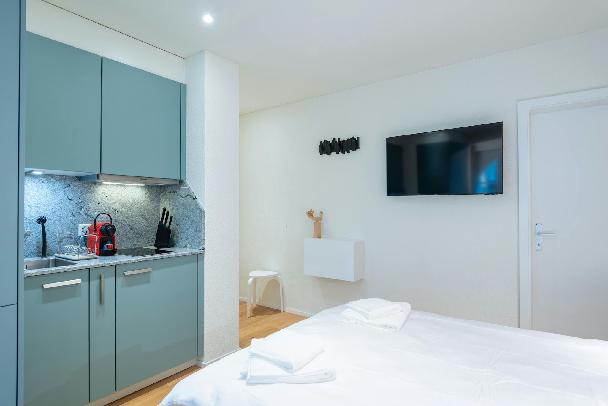 This furnished flat is the ideal accommodation for business travellers coming to Zurich. The furnished flat impresses with its unique location and elegant design. In the studio you will find everything you need for work and leisure. In the cosy living/sleeping area you will feel at home and in the kitchen you will find everything you need to cook. Of course, a private bathroom with shower belongs to the flat. All in all, this furnished business flat offers all-round comfort in a prime location!