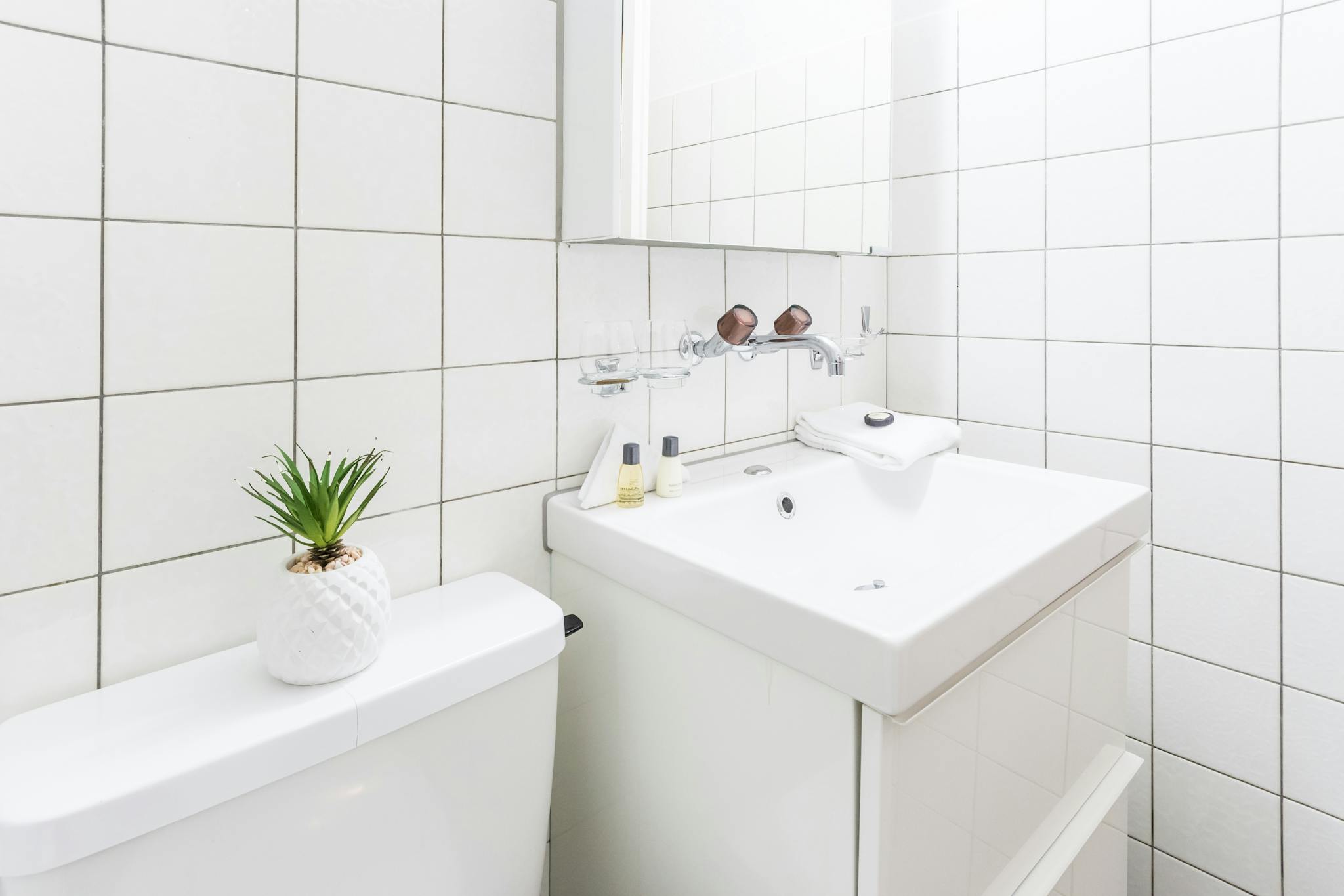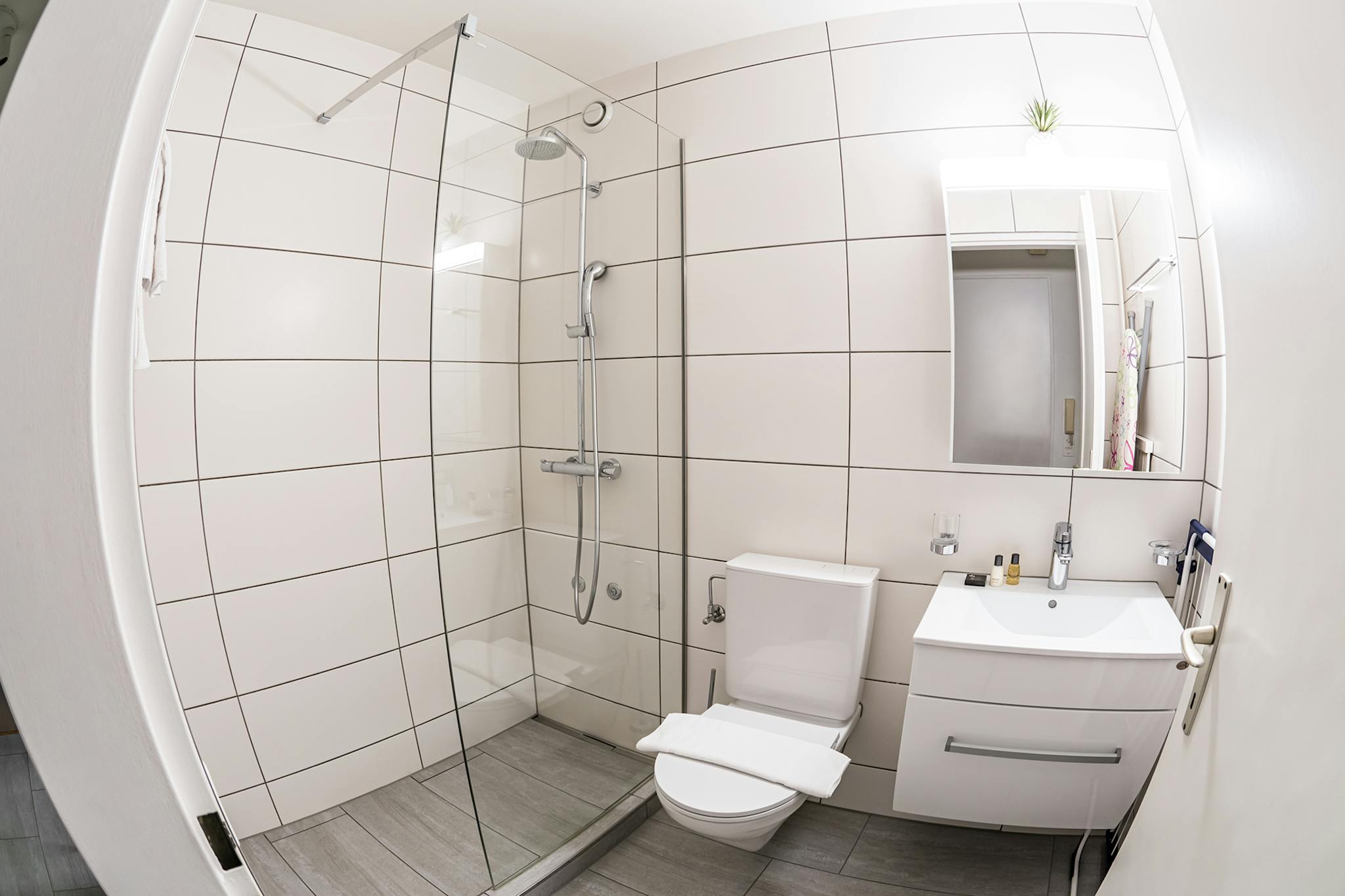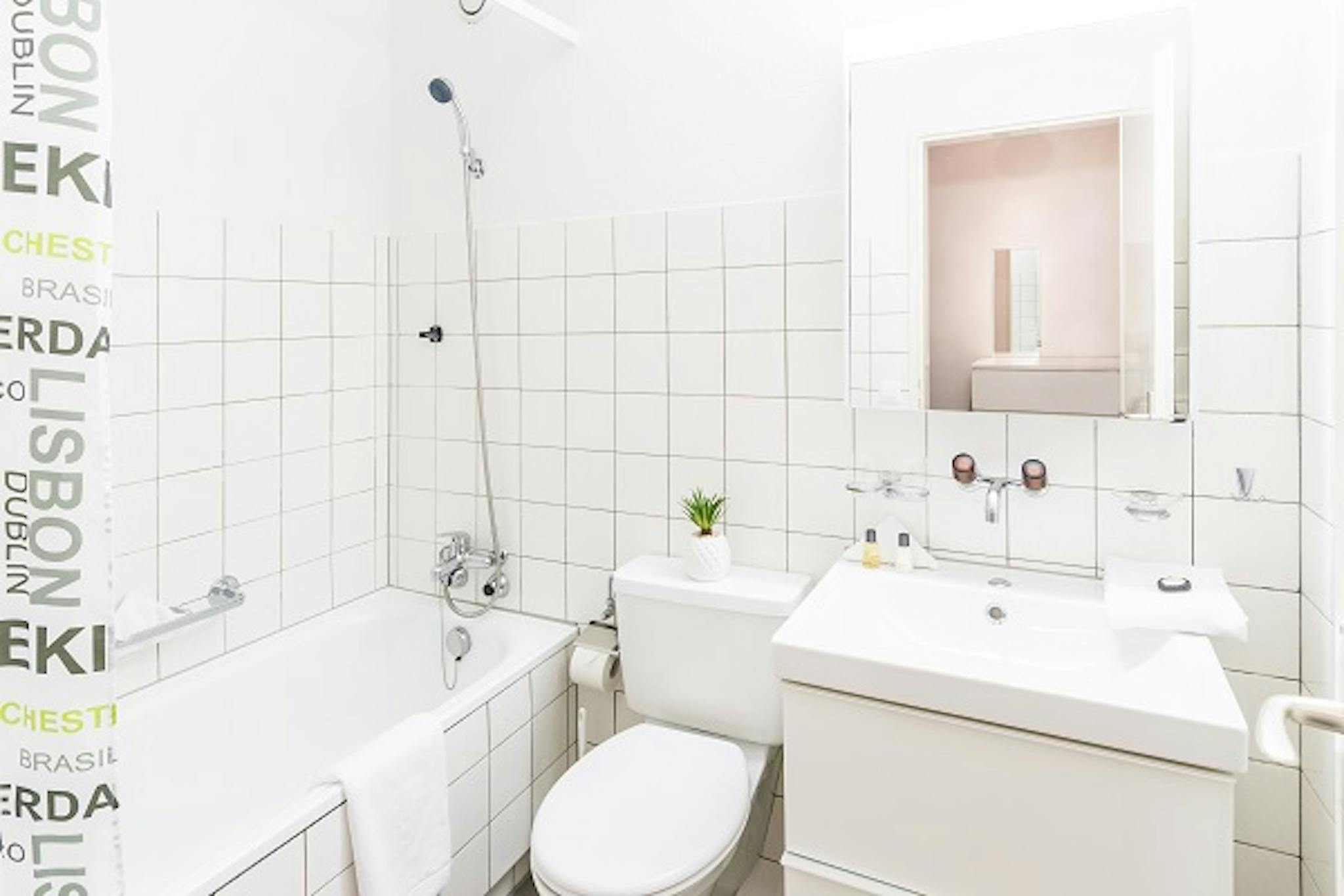 The separate bathroom – with a bathtub or shower – has a convenient size and is perfectly equipped with toiletries. A washing machine as well as a dryer are available in the laundry room in the basement for free use.