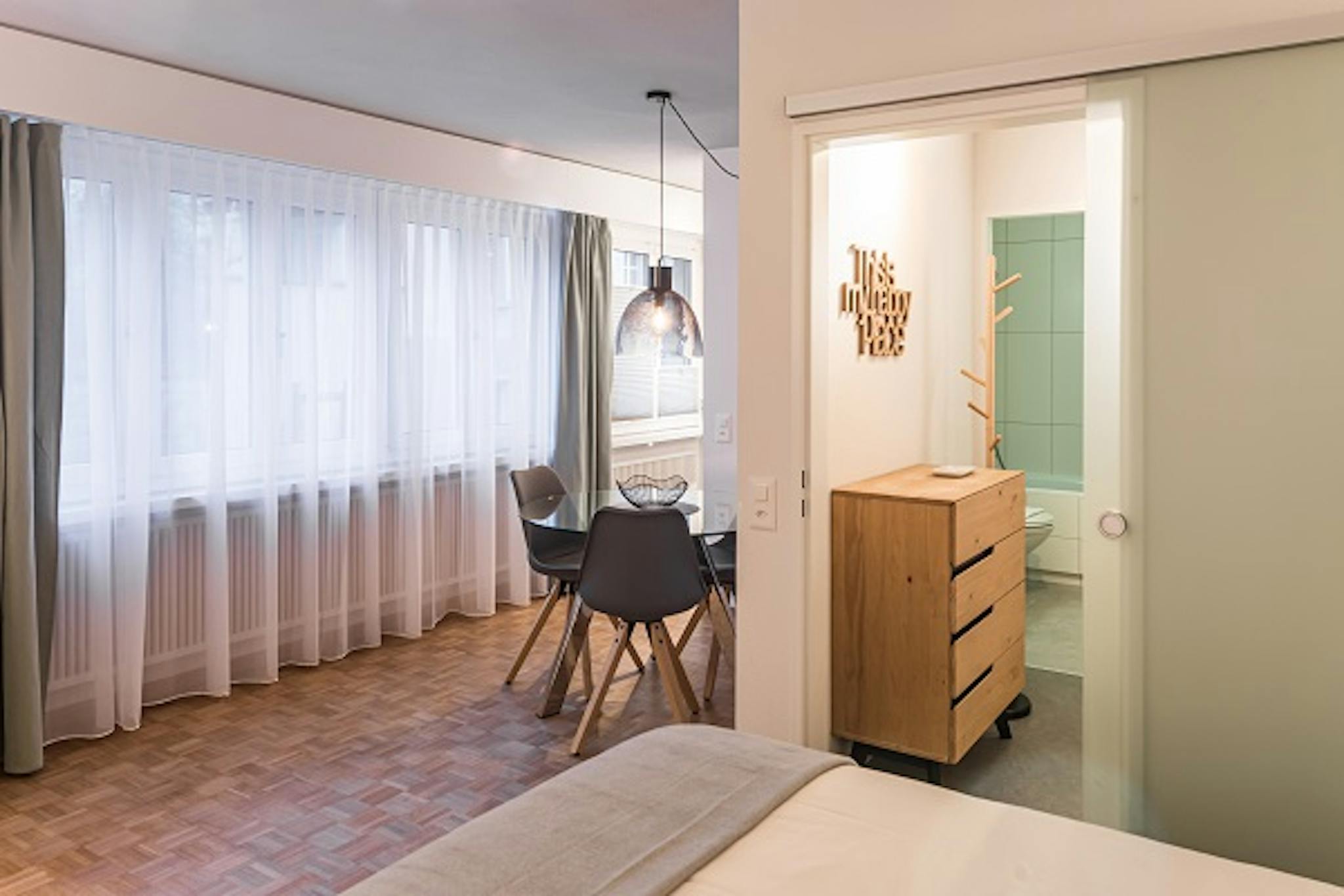 Non-SmokingNot allowedThe 35sqm studio apartment is provided with high-quality furniture and shows modern design. You will sleep in a qualitatively convincing queen size bed. The cosy living area furnished with a comfort chair and a coffee table in front of a flat screen television is a place of relaxation. A wardrobe and a dresser in the hallway provide plenty of storage space.