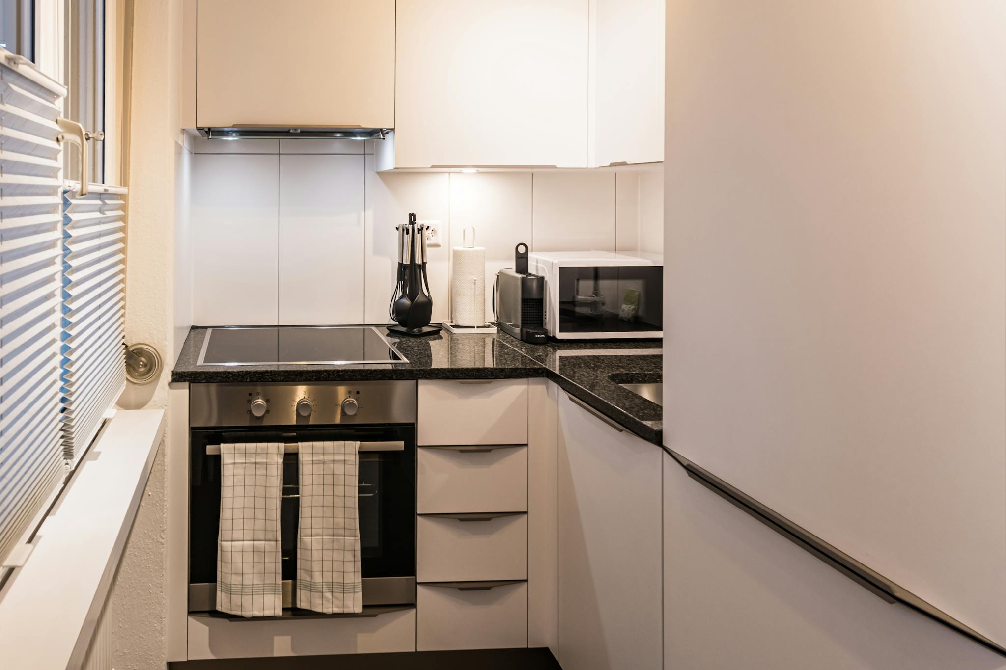 The separate kitchen is fully equipped with a ceramic glass hob, an integrated oven with grill function and a refrigerator incl. a freezer compartment. Kitchen supplies such as pots, pans, high-quality crockery, cutlery etc. are provided – cooking and dining has never been more pleasant.