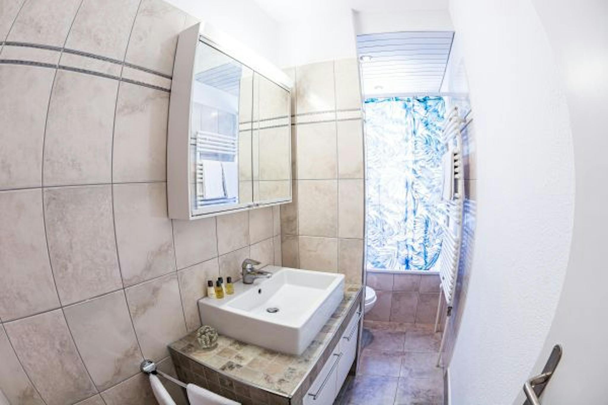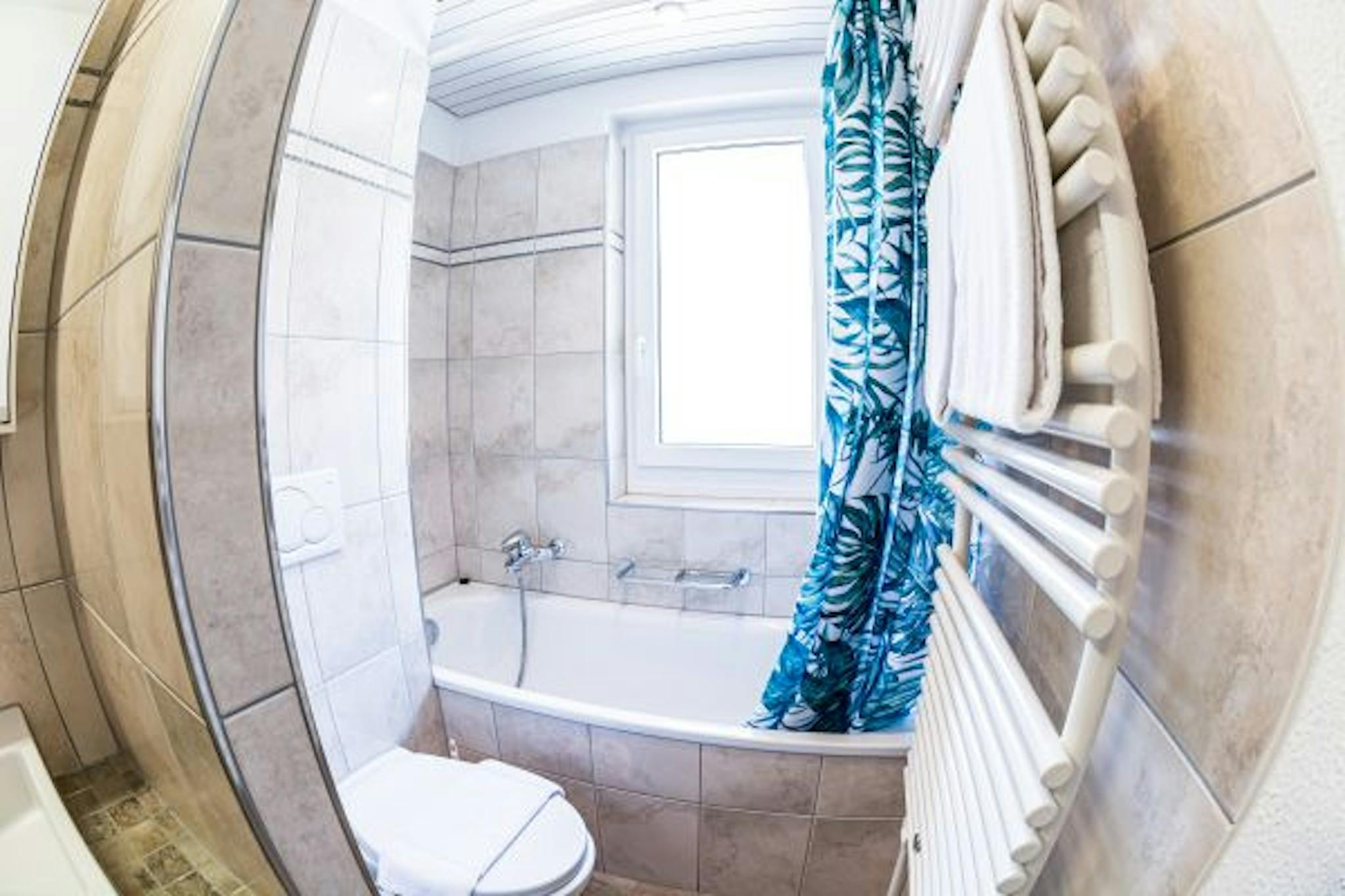 The separate and modernly tiled bathroom – with a bathtub – has a convenient size and is perfectly equipped with toiletries. In the basement there is a laundry room for common use.