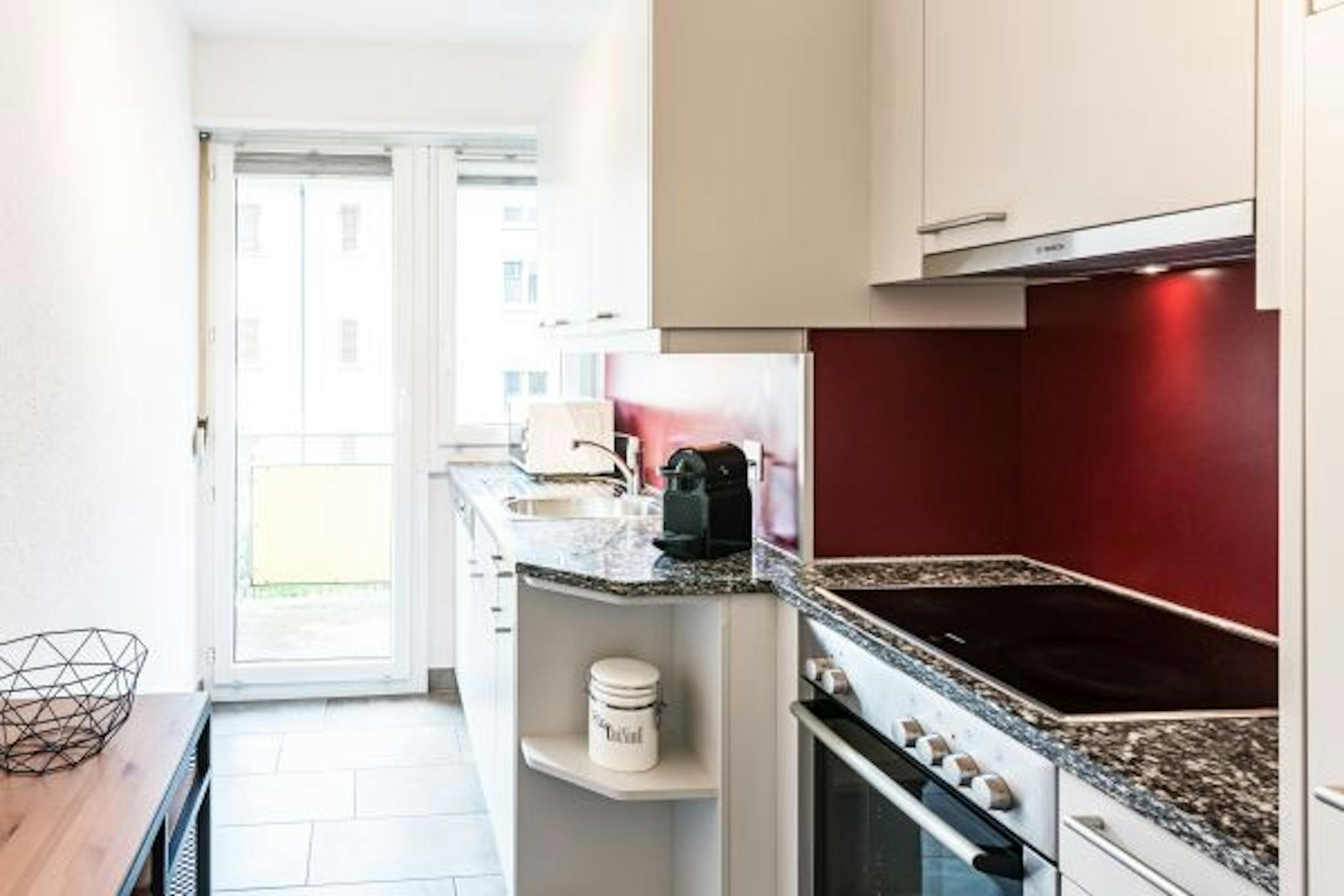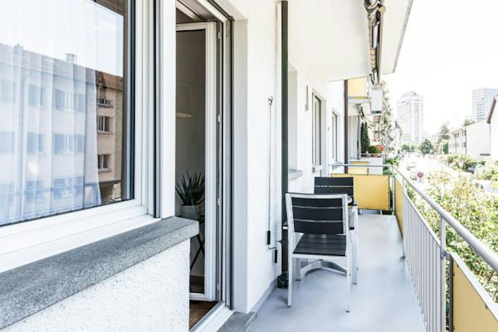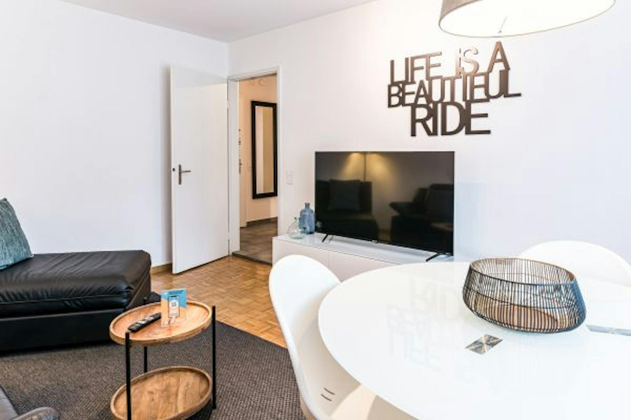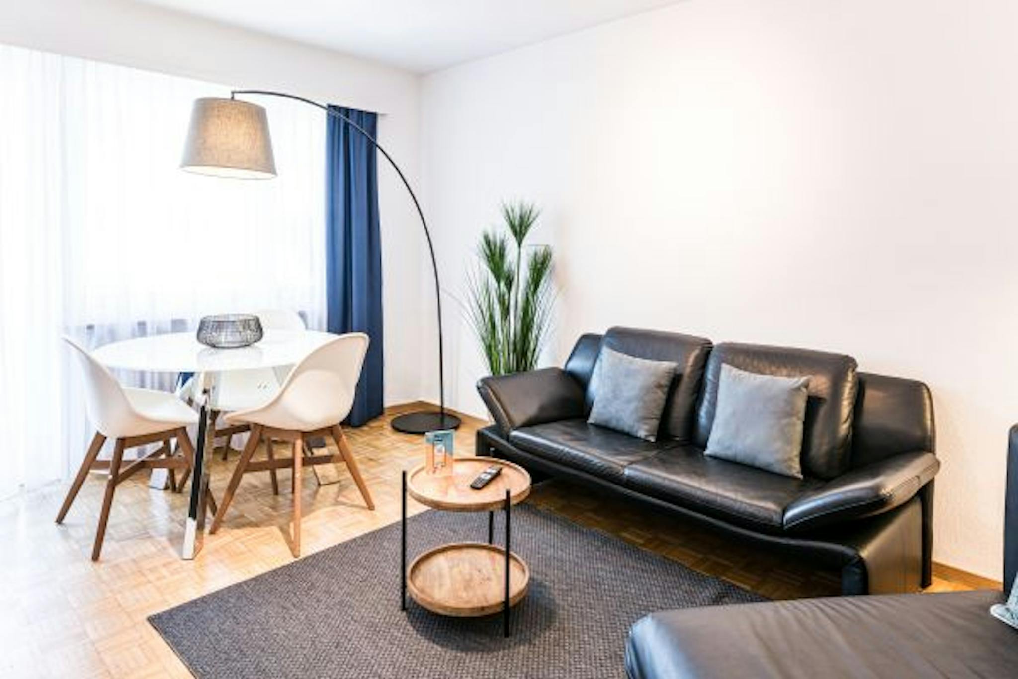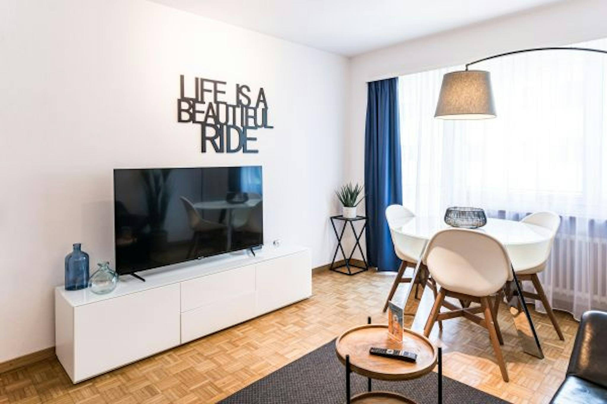 Non-SmokingNot allowedThe functional as well as cosy 47sqm apartment, furnished in a modern way and with a spacious room layout provides everything to guarantee a pleasant living atmosphere for you. The large-scale dining room invites you to relax in your free time as well as the comfortable sofa with coffee table and flat screen television. Enjoy dinner with up to four people at a large dining table. The separate bedroom is conveniently equipped with a double bed, wardrobe and a valet. The balcony with bistro table and two chairs overlooks a quiet district street. Enjoy a laid-back breakfast in the sun before you start the day.